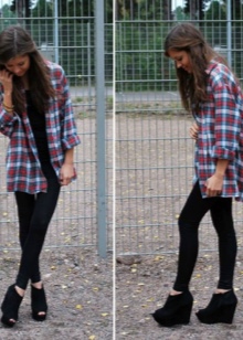 Wedge boots - it is a universal model, suitable for various skirts, narrow jeans, creative tops and even flowing dresses of delicate shades. What such shoes do not tolerate is wide trousers with flared leg. Otherwise, create a memorable image quite easily.