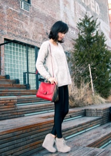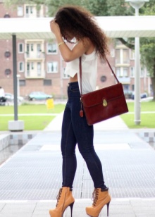 So that the silhouette does not seem massive, you should not wear wide trousers and midi skirts with such shoes. High wedge visually makes legs slimmer, and their owner is higher. The hue of ankle boots should be in harmony with the overall color scheme. An important condition - no need to pick up a bag of the same color as the semi-boots - you can add yourself age.