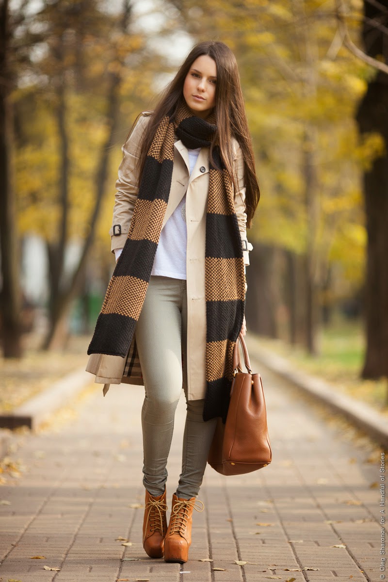A shirt or a jumper, a trench coat and a raincoat of bright color can become the top for shoe laces. A plum, red or burgundy raincoat will do.