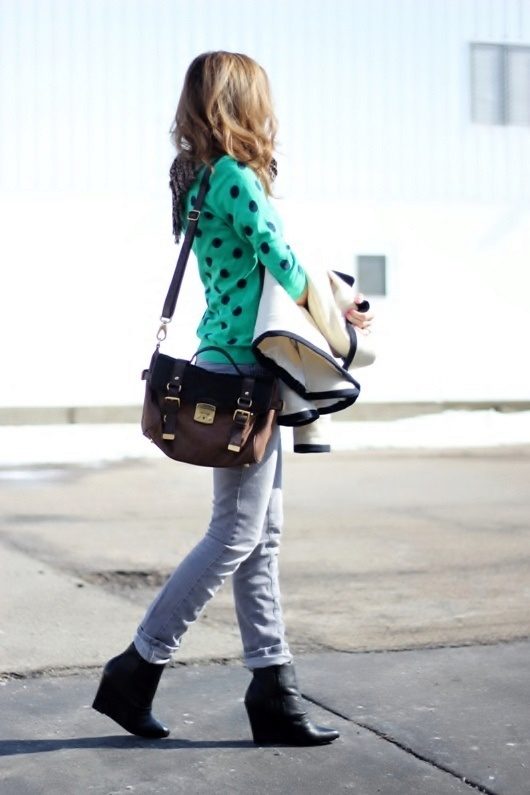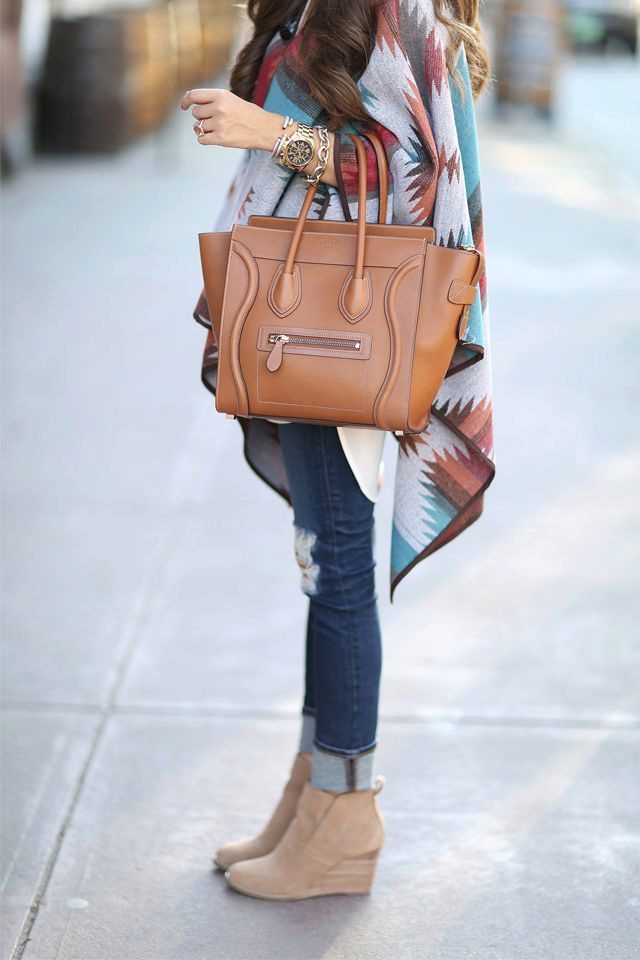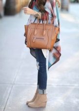 An interesting and stylish will be a combination of wedge ankle boots with a tractor sole and a free poncho or capa with jeans and a felt hat. This set will be ideal for long spring walks.