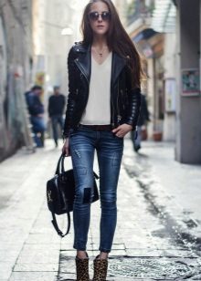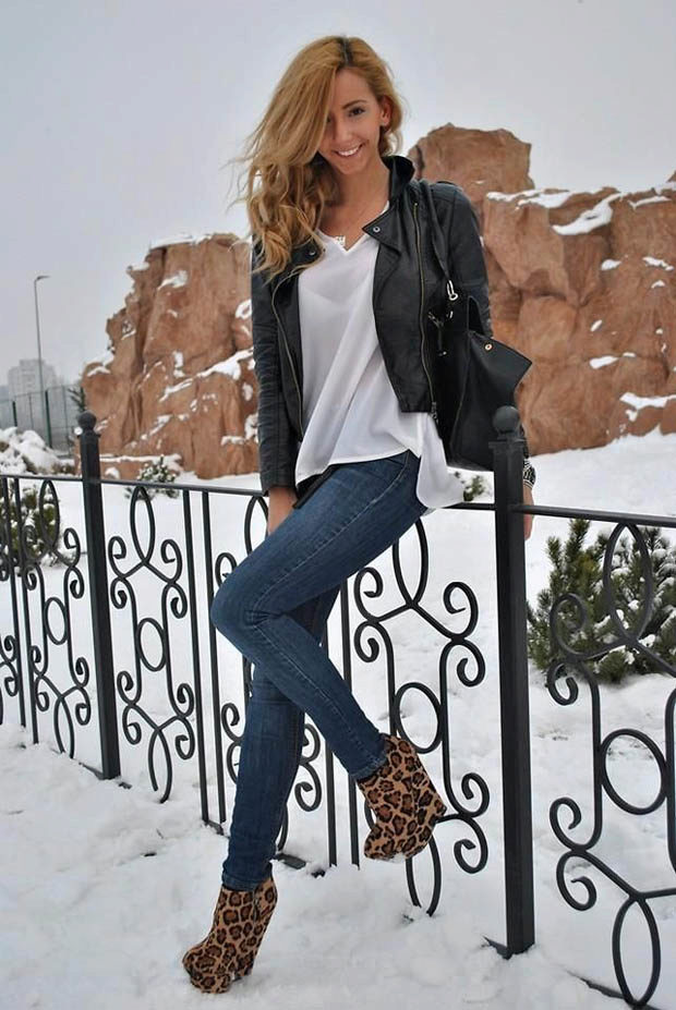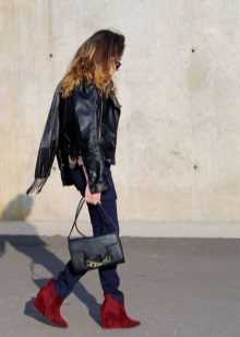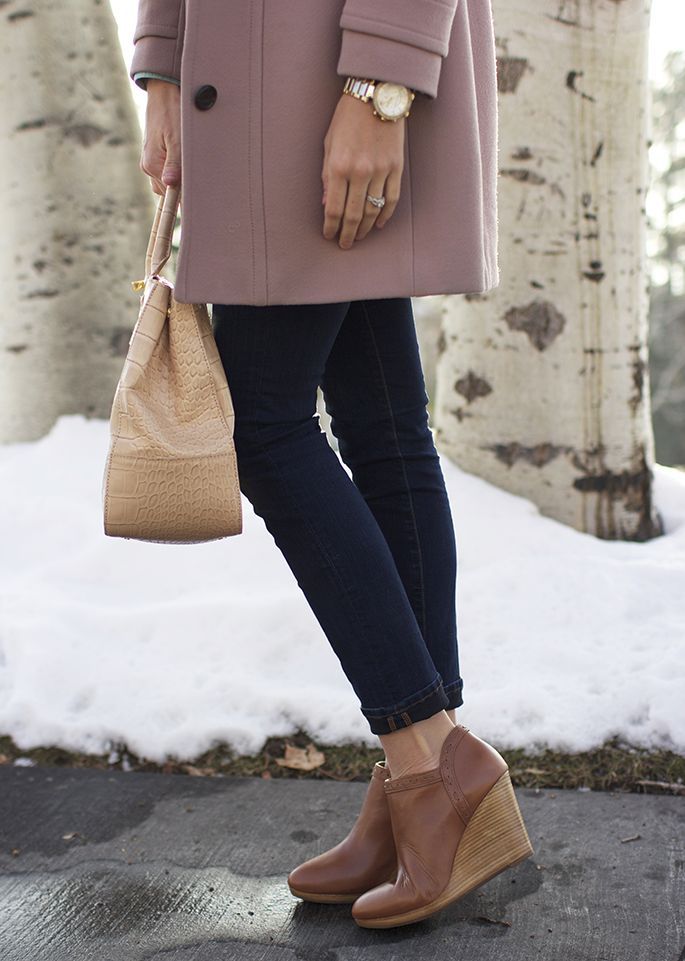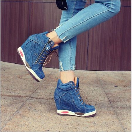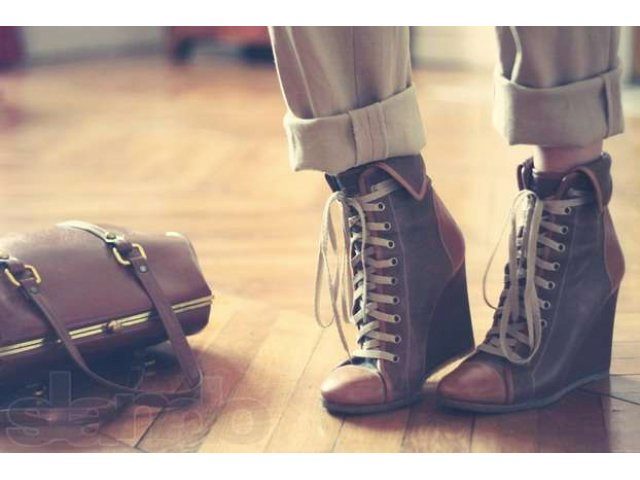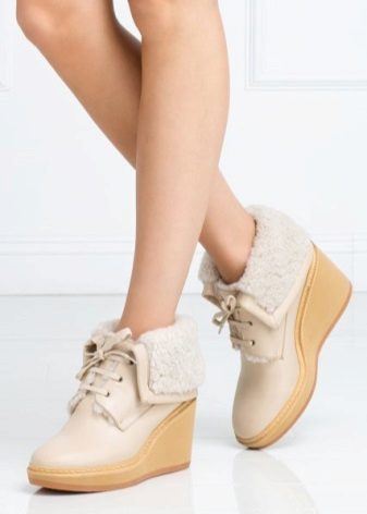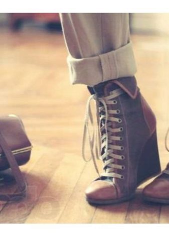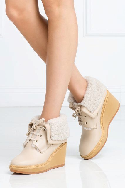 Ankle boots with a low wedge with lacing will look great with a short leather jacket or a cropped sheepskin coat and jeans.