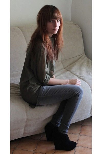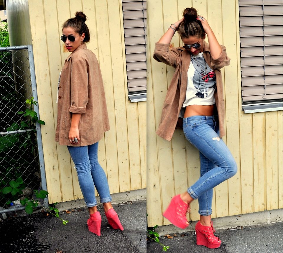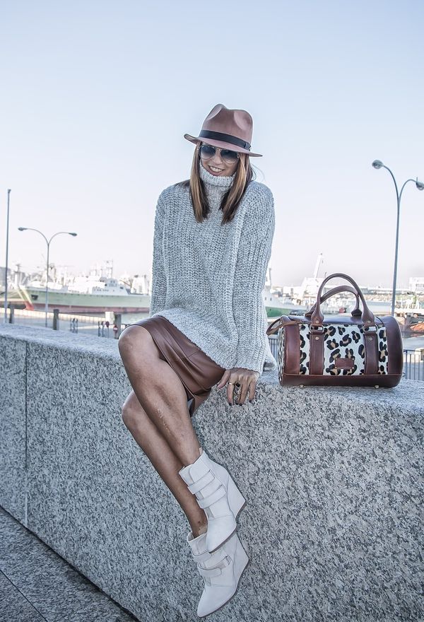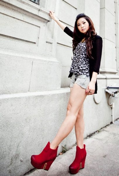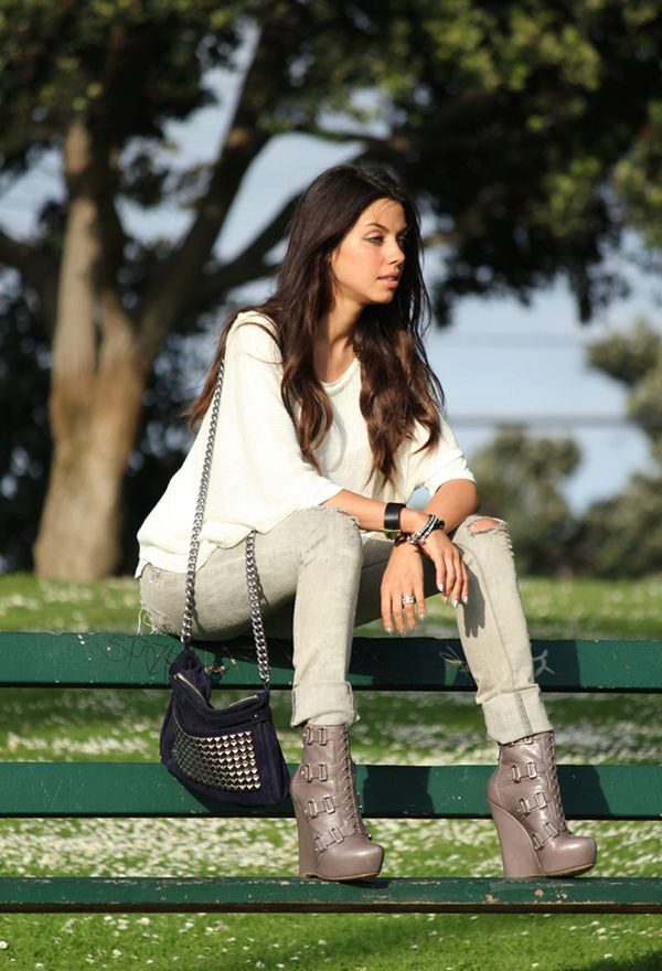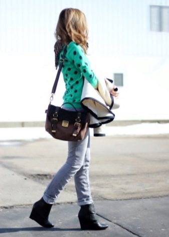 In the warmer seasons, it is appropriate to combine the wedge boots with a loose cardigan or a large knit sweater. This will be beautiful as a combination with tight pants or jeans, and with a fluffy mini skirt or midi length.