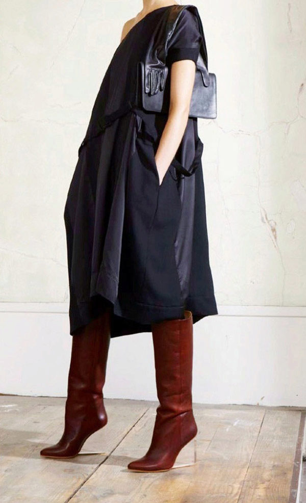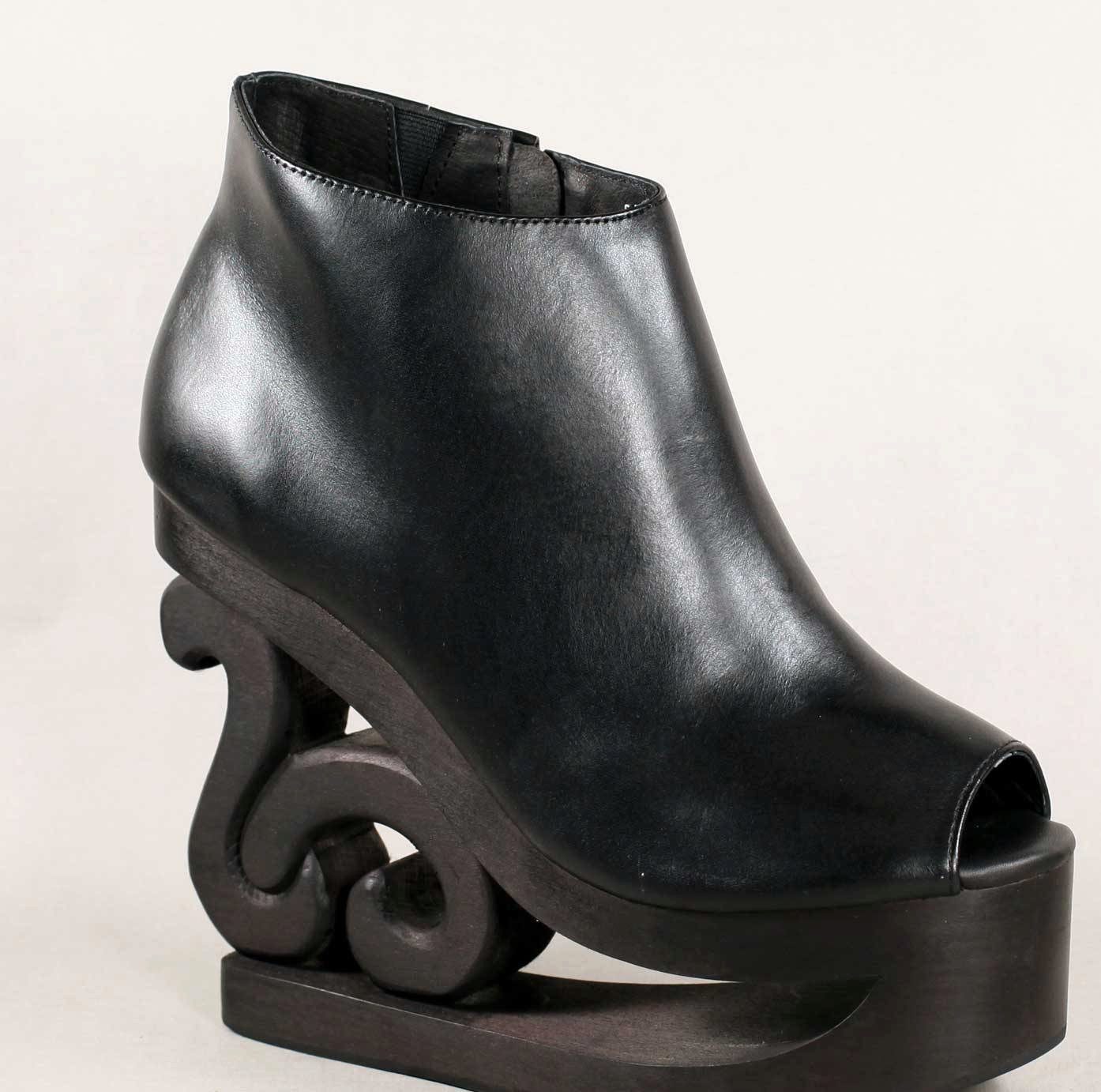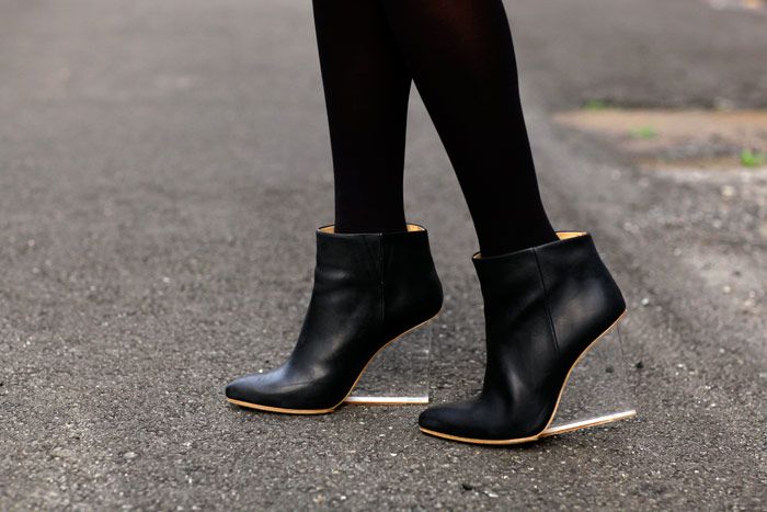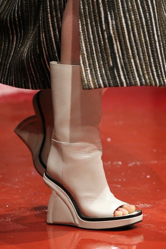 Jeffrey Cambel's fancy booties also attract attention: a florid detail instead of a laconic, deaf wedge makes the booties look more like a piece by an architect or a sculptor than a fashion designer.