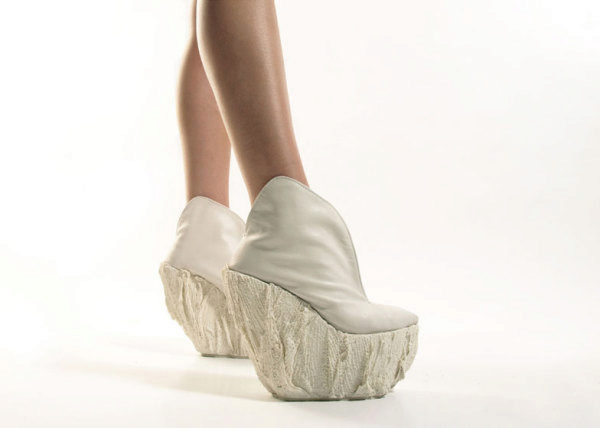 Designers create fashionable things, not just for everyday wear. Among shoe designers there is an increasing number of creative ideas bordering freakiness and fashionable madness. Looking at these shoes, we often ask ourselves: is this design for the sake of design, or are such shoes worn by the most extravagant and bold ladies? Or maybe it is for these fashion trends future? Fashion designers like to experiment with shoe boots on a wedge, hypertrophically changing their shape or decorating it richly. Massive white shoe boots of Laura Papp are striking with the decoration of the wedge heels: the designer used lace and liquid porcelain to work on her.