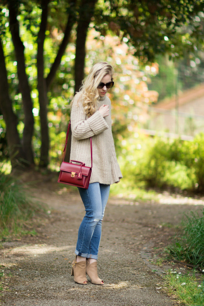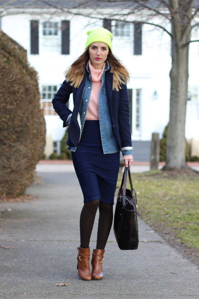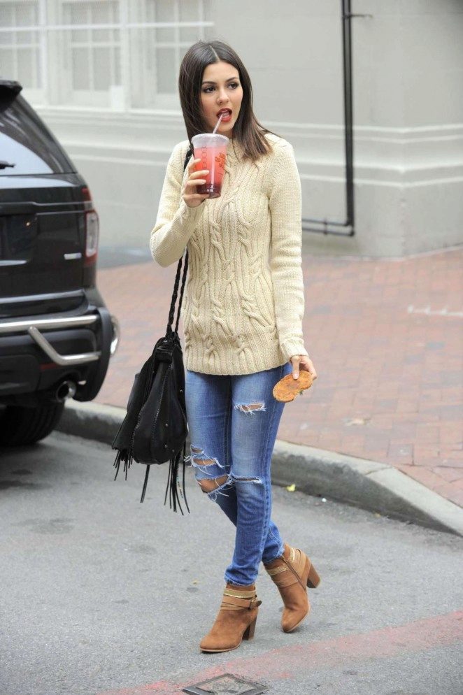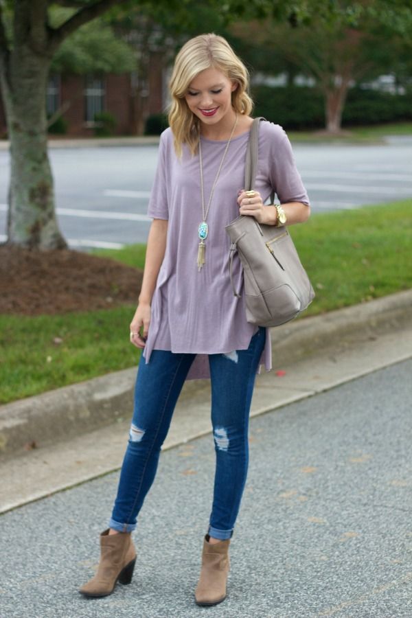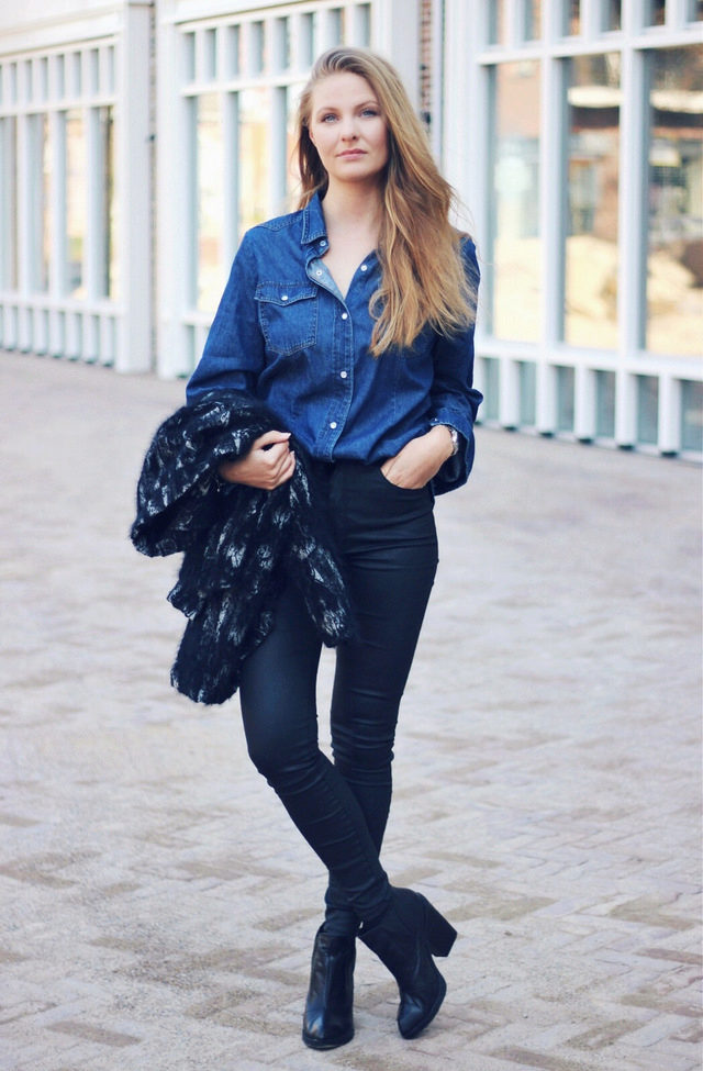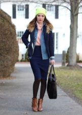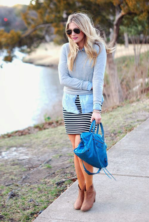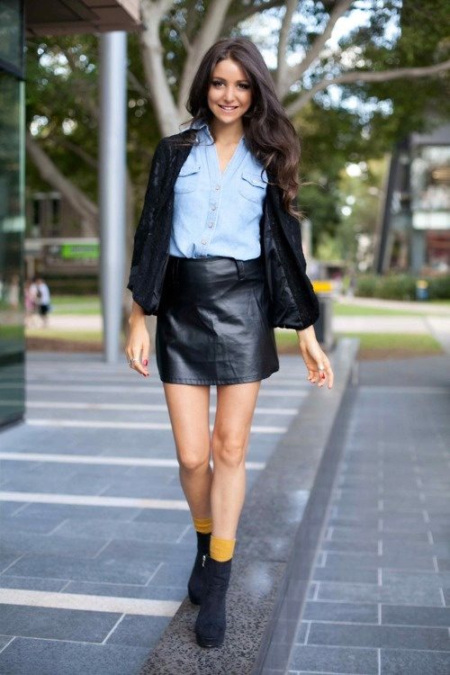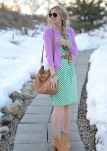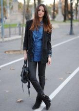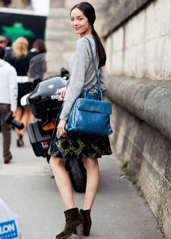 - Suede thick-heeled ankle boots will look great with a cropped denim jacket to match with it, tight black tights and a knitted mini-dress of a free cut. To add brightness to the outfit, you should stop the selection on a large red bag.