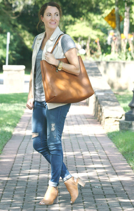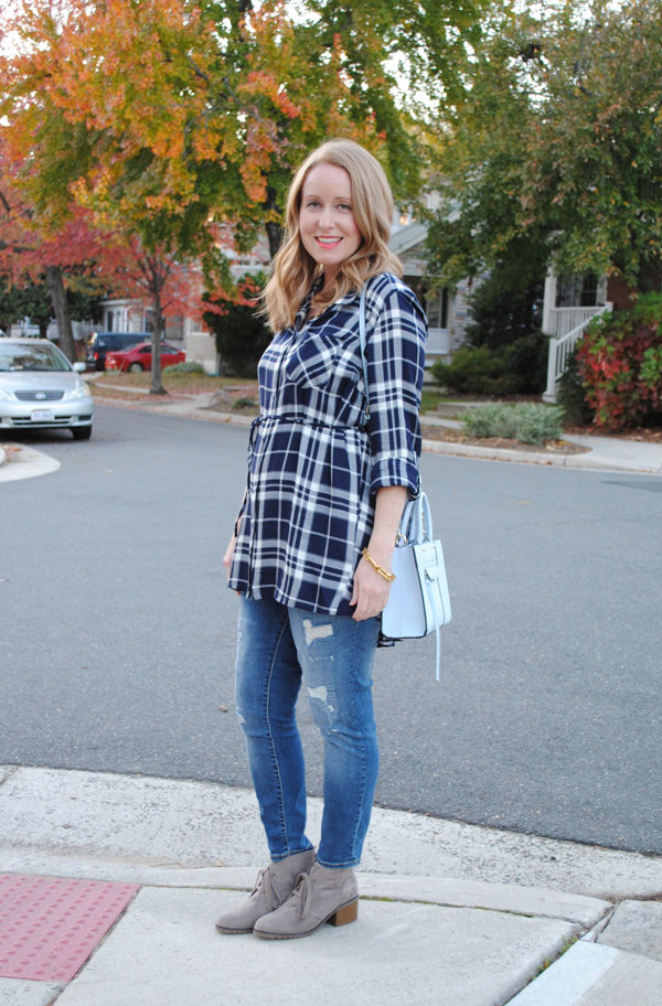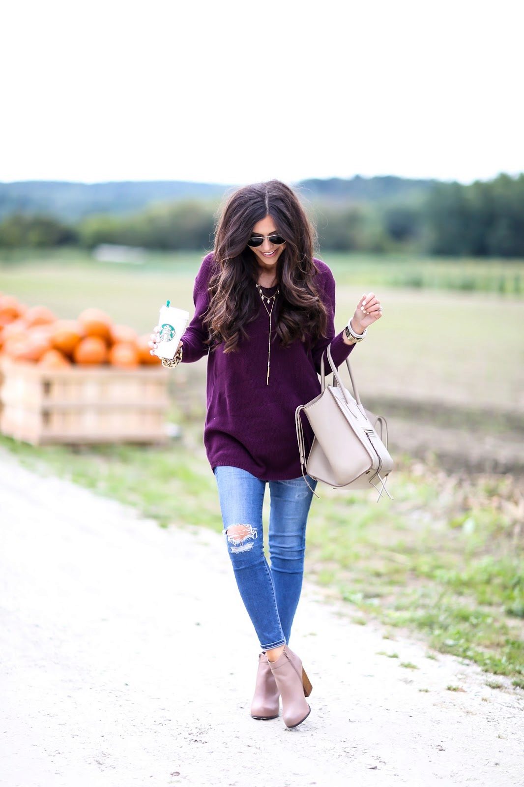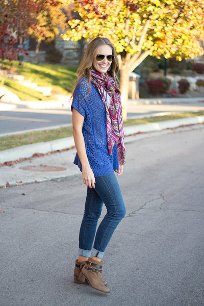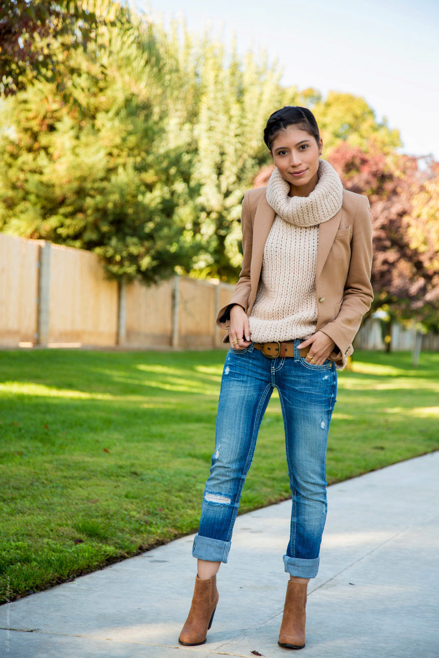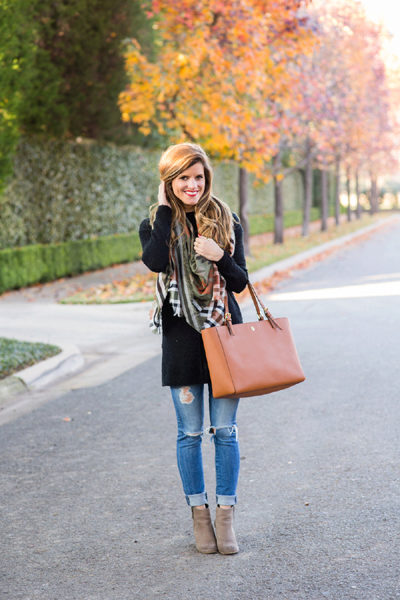 - Suede thick-heeled ankle boots will look great with a cropped denim jacket to match with it, tight black tights and a knitted mini-dress of a free cut. To add brightness to the outfit, you should stop the selection on a large red bag.