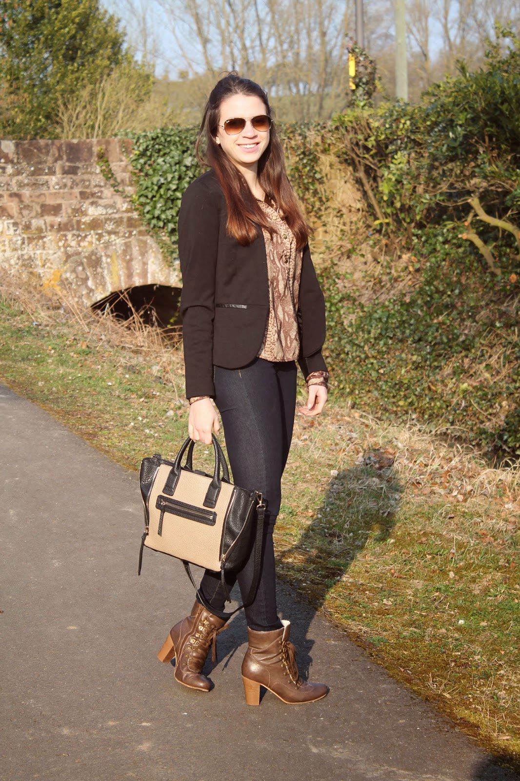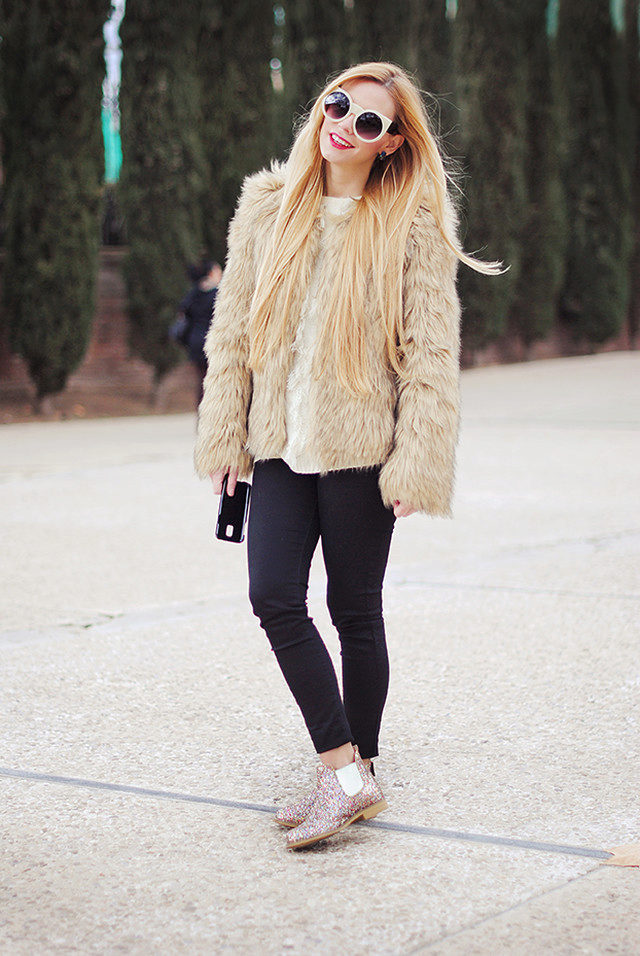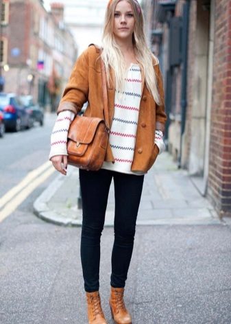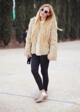 - Ivory booties in a small tractor sole with a thick square heel and lacing perfectly fit into a stylish combination of tight black trousers, a light chiffon shirt and a cropped sheepskin coat to match the shoes.