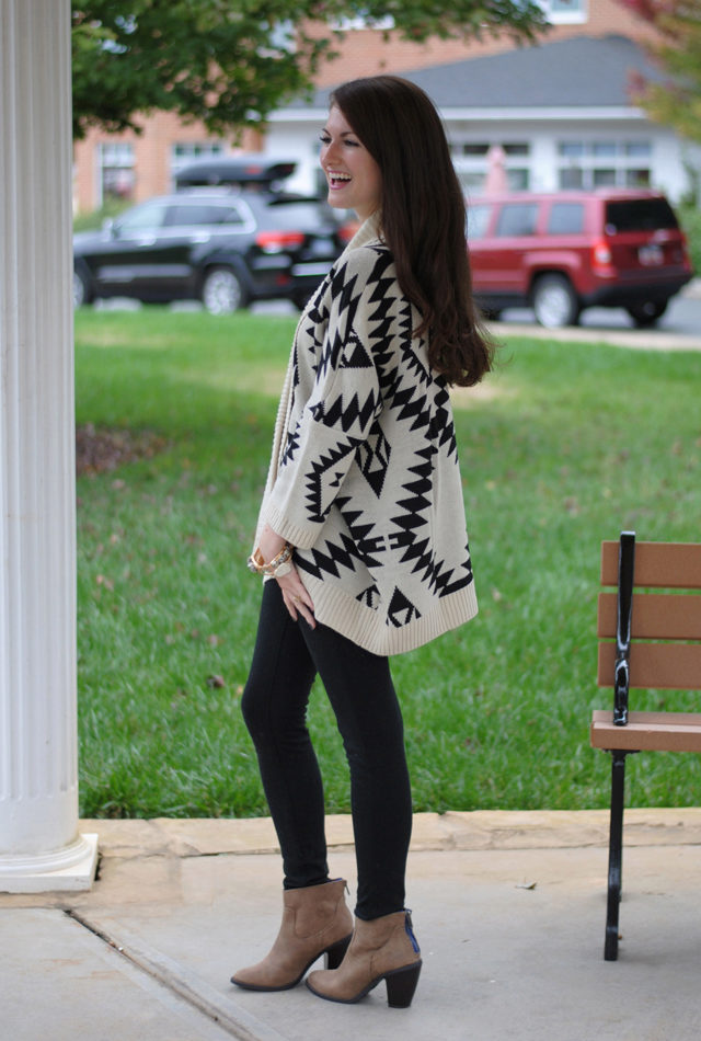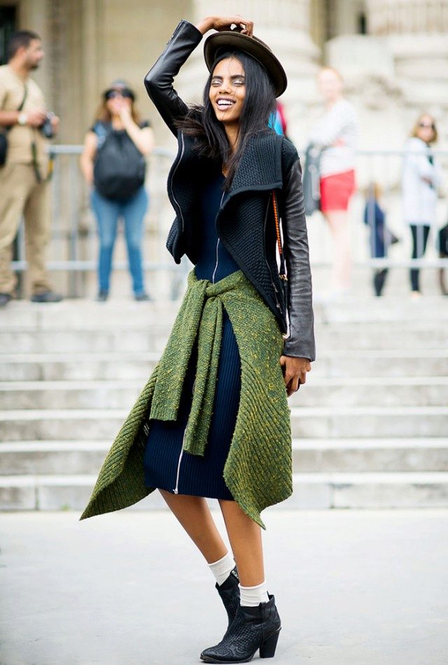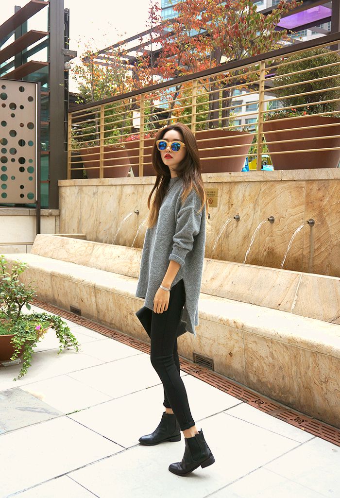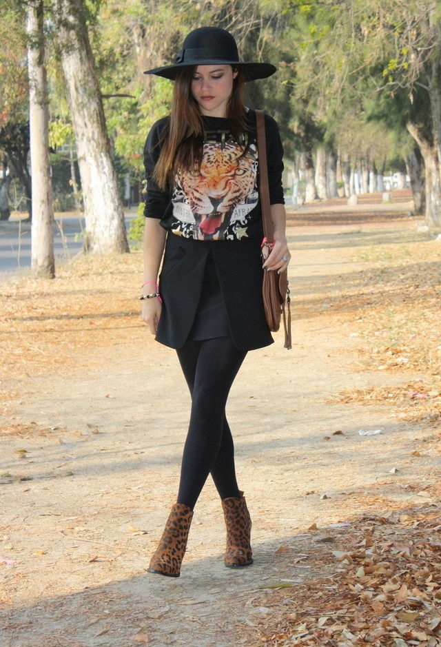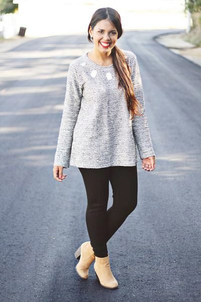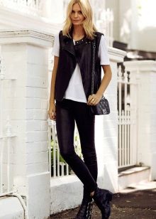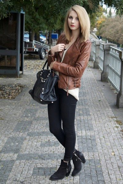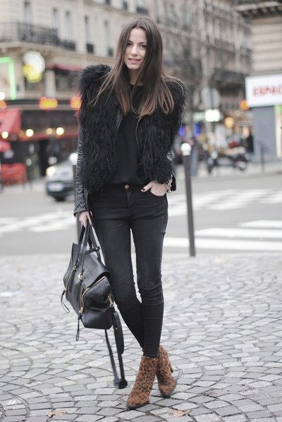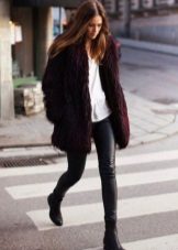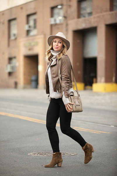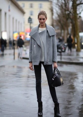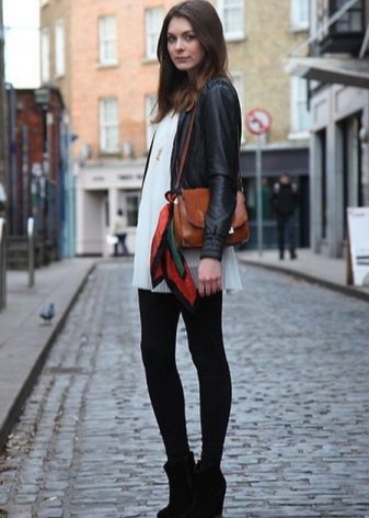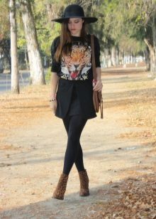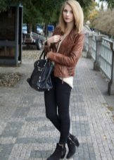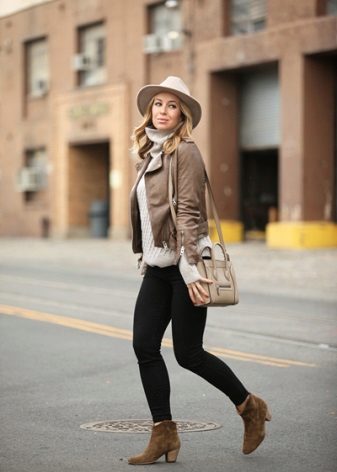 - Leather black ankle boots and leggings in them have long since become a classic combination. Having added a black and white loose knit jacket and a wide-brimmed felt hat, you can create a quite interesting and trendy look.