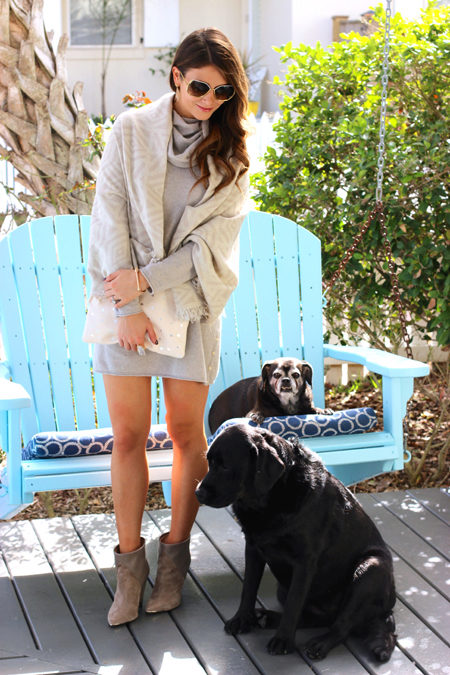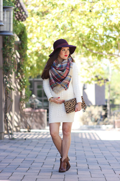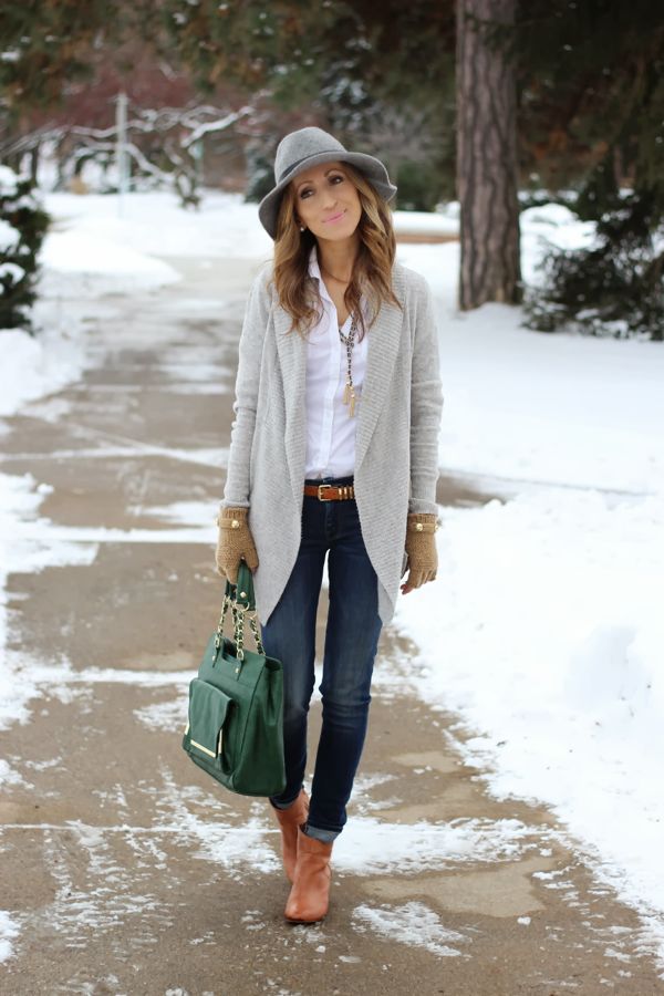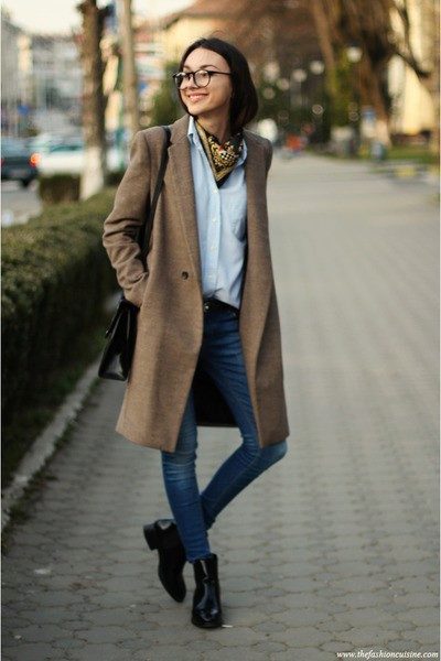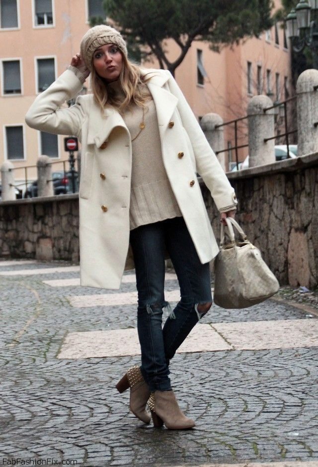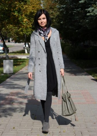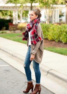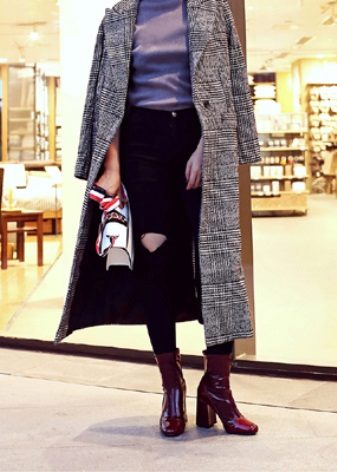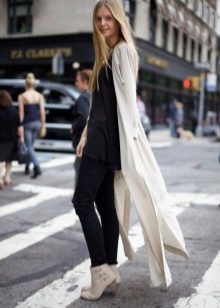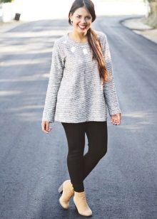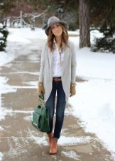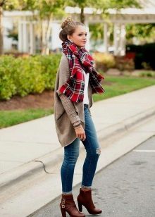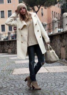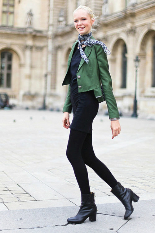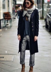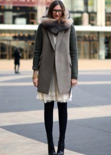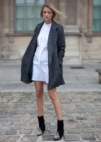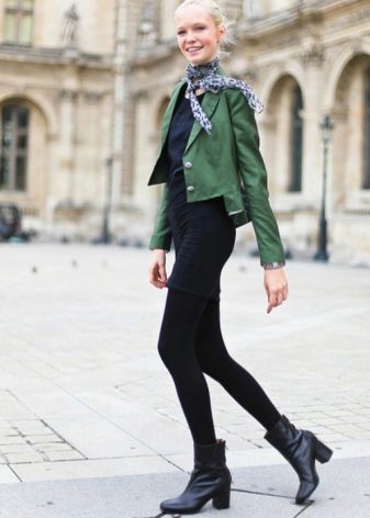 - White booties with a thick but not very high heel will look great with dark gray tight leggings and a dark green drape coat with a straight cut. To add a little brightness to the outfit, you can use a volumetric scarf with a checkered print, black and yellow shades.