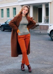 But bright details will not be superfluous in such a rather restrained image, so a large orange rectangular clutch will fit perfectly.