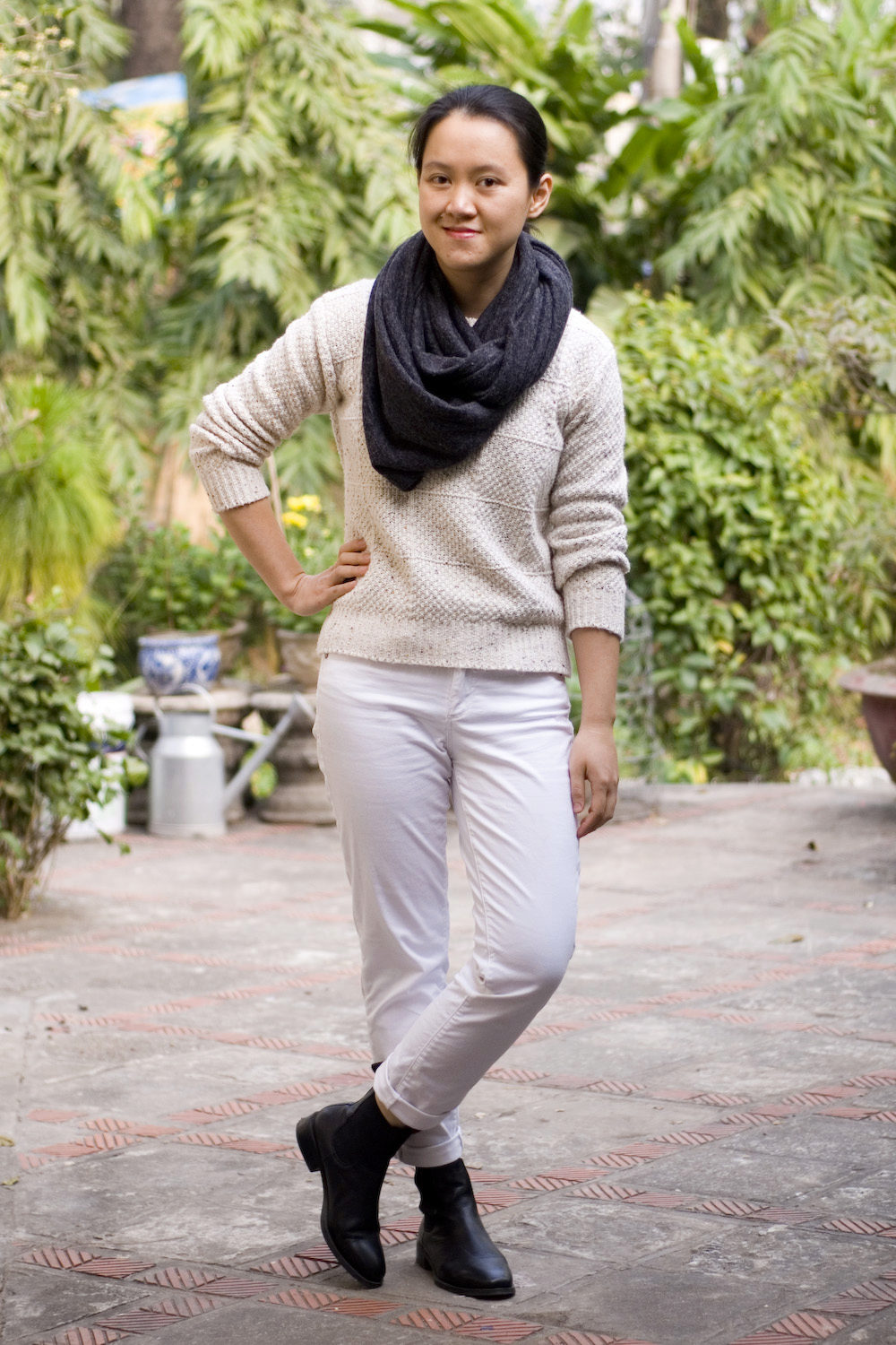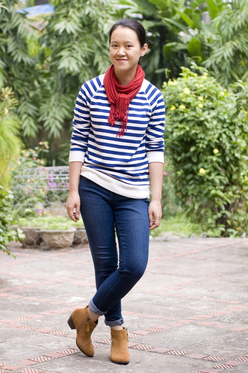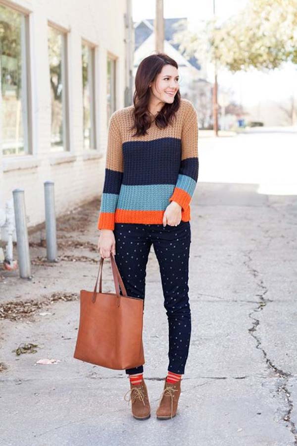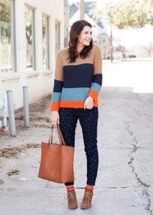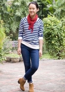 - Tight blue-and-white striped trousers and a white T-shirt will look great with brown leather ankle boots with a thick and high heel. The stylish details will not interfere either, so a large yellow backpack and a knitted hat will look perfectly appropriate to him.