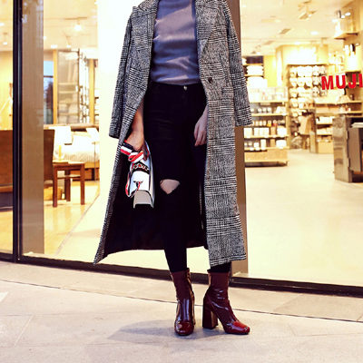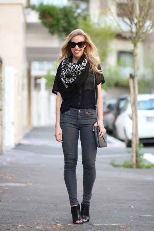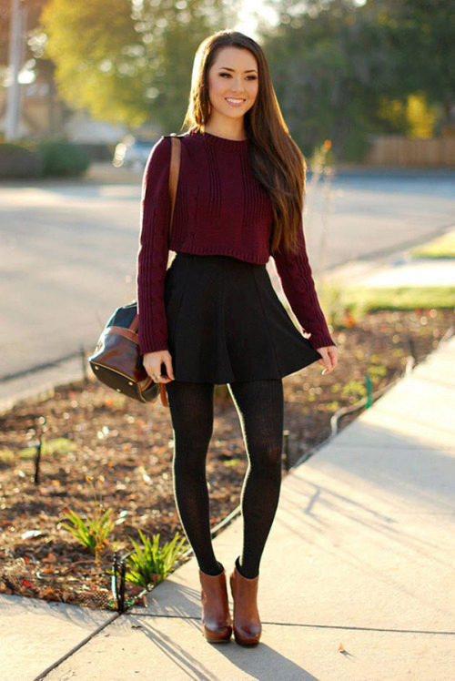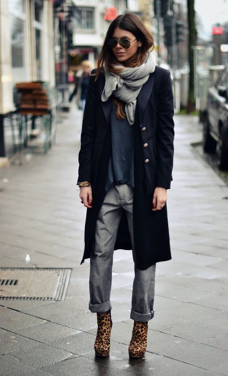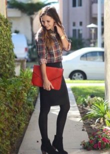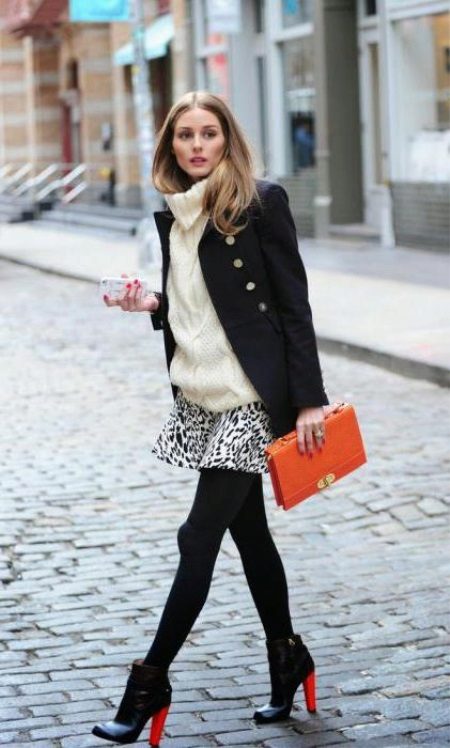 - Black leather ankle boots with a high red heel look very impressive with thick black tights, a black and white skirt with a leopard print, oversized sweater from thick yarn of a milky shade and a black cropped coat.