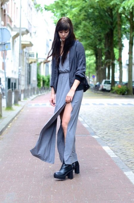 - Ankle boots can become a full part of a rather light look if you choose a model of black leather with a tractor sole and a thick square heel. A light cotton sundress in the A-shaped floor with two side slits and a thick olympic shirt is what you need to create a stylish casual outfit.