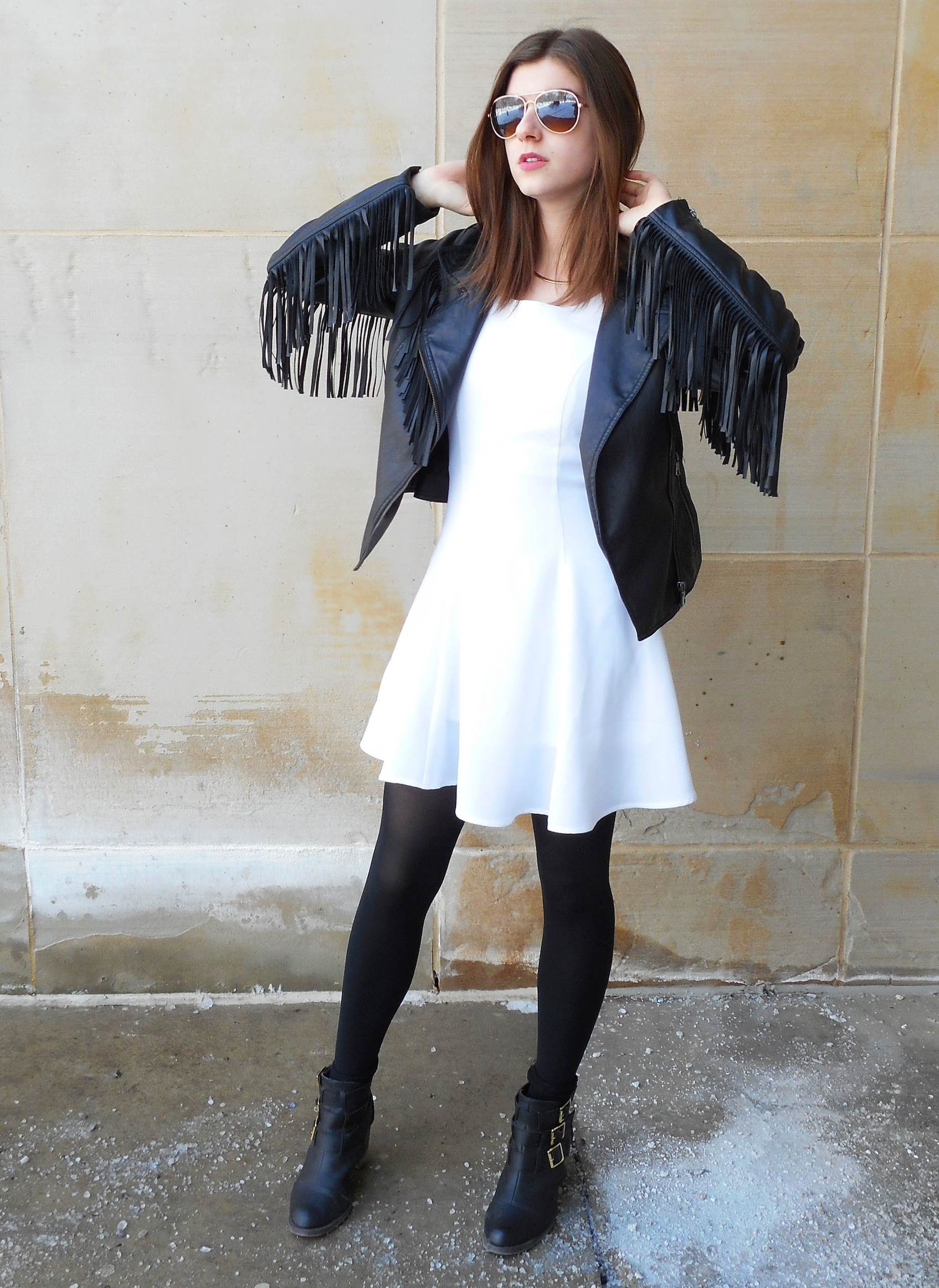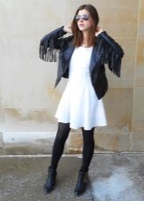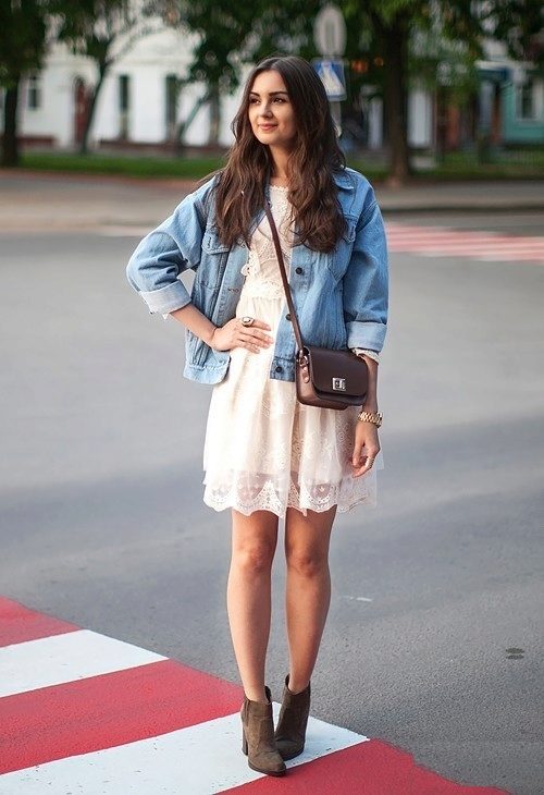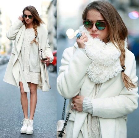 One of the latest trends - ankle boots on tractor soles. Contrary to popular belief that this sole looks rough, it can emphasize the slimness of the legs and create an interesting image. Flying dresses made of lightweight fabric and knitted are well suited for such a sole. A white dress in a complex with a single-colored coat and white lace-up ankle boots will allow you to create a beautiful urban style, perfectly suited for walking and romantic encounters.