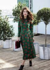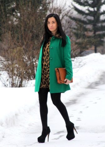 Warm knitted and wool dresses look great with dark tights and ankle boots. A beautiful effect gives a combination of emerald green and beige tones. This color range is well complemented by a brown shade of shoes.