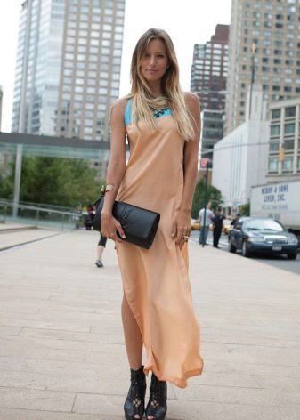 At selection of a long dress absolutely low shoe boots will look beautiful. Chic will add a long side cut to the dress that opens the legs. If you like unusual bows, then try combining rudeness and grace. Massive wedge ankle boots in combination with a long dress look unusual and extravagant.
