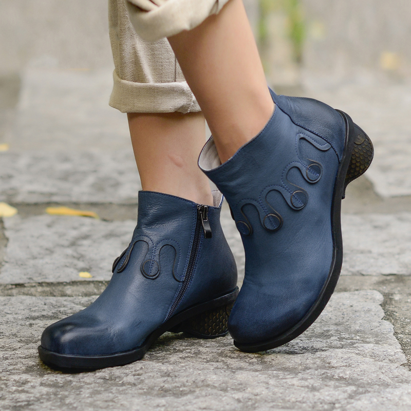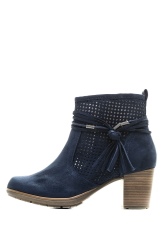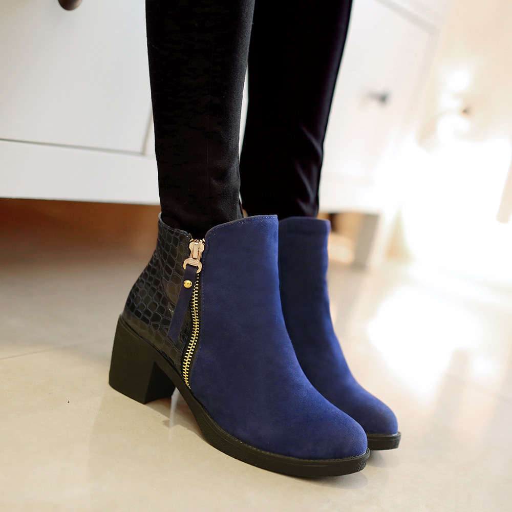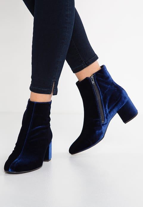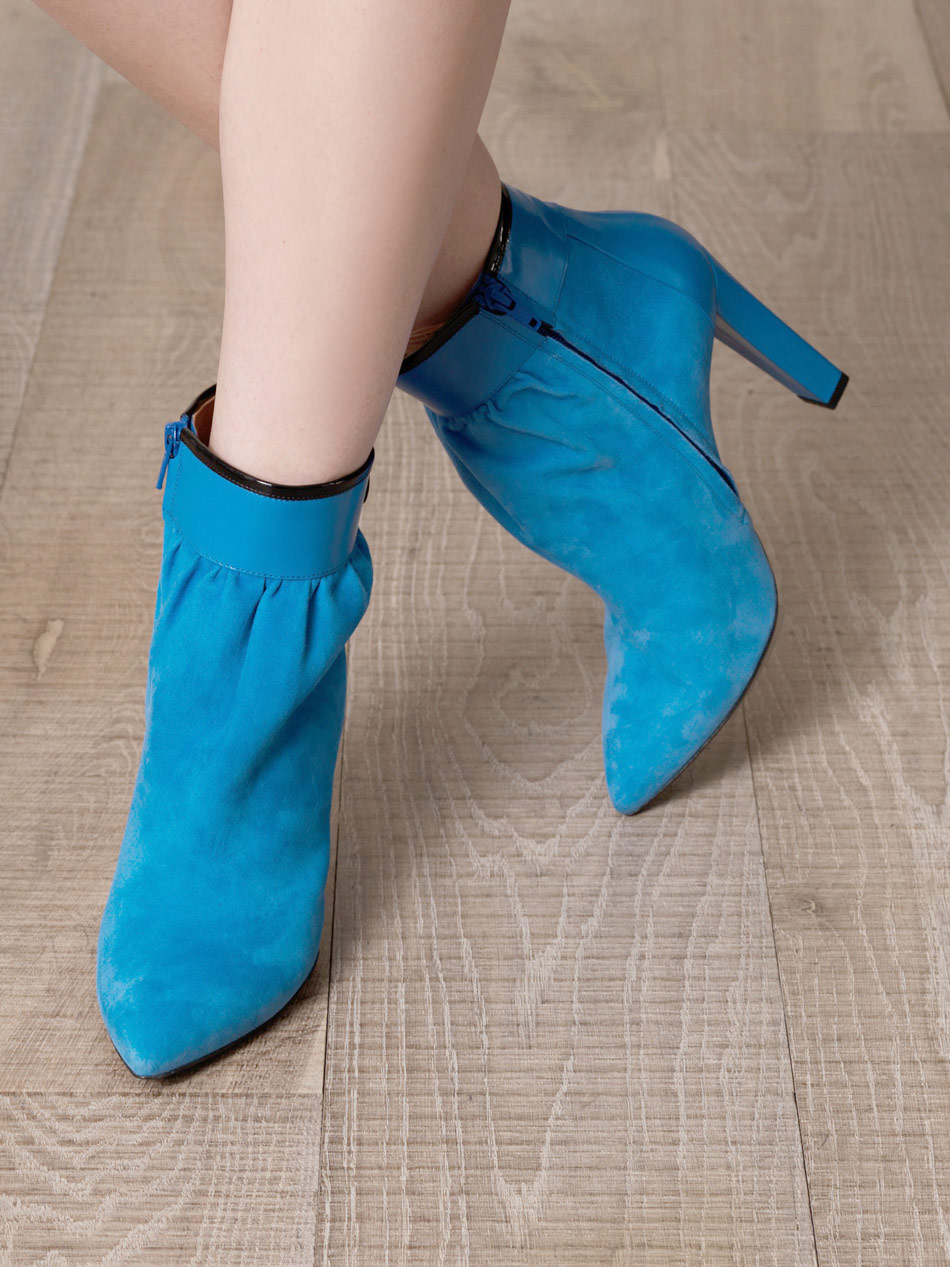 Blue ankle boots vary in material and heel feature.