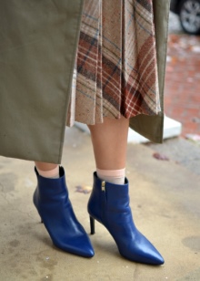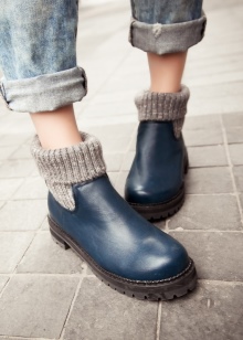 In the cold season, blue boots with leggings or tight pants will look great. Ankle boots with a wide bootleg or assembled “in accordion” are best suited. They can be on a small heel, can be on a flat sole or on a wedge.