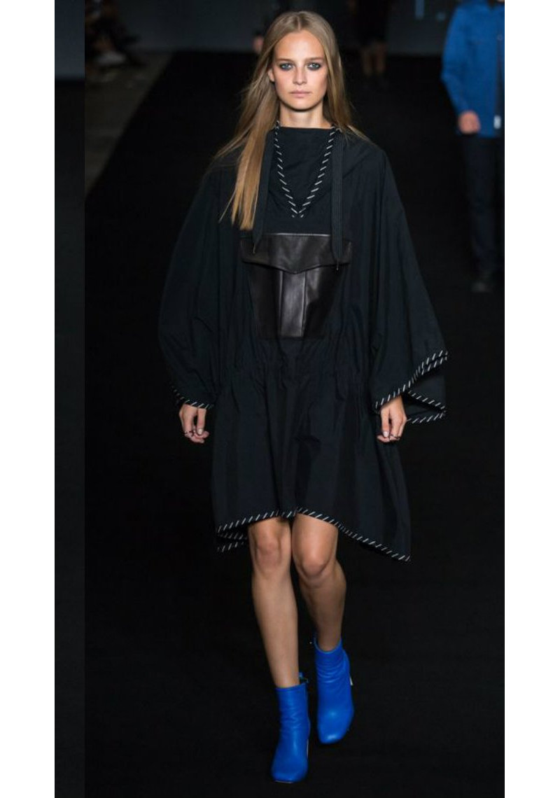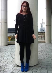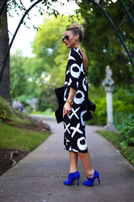 You do not pursue this goal, but just want to create a casual look, then you just need to find a dress of free fit in your wardrobe above your knees and shod blue ankle boots with a small heel or wedge heel. The image will be stylish, and you will be comfortable.
