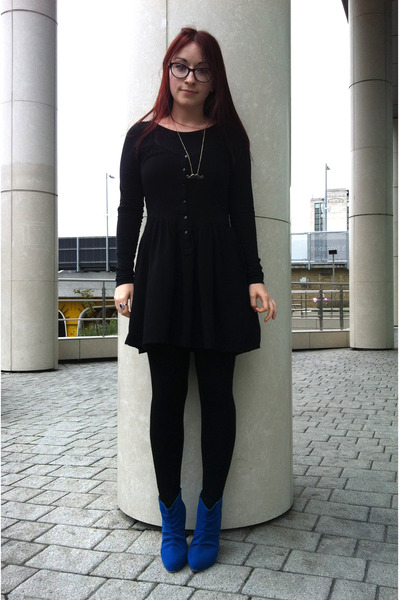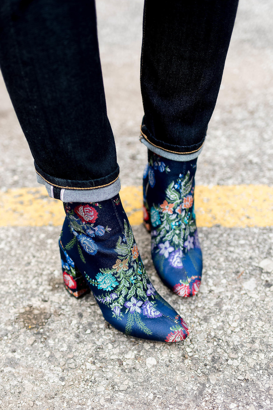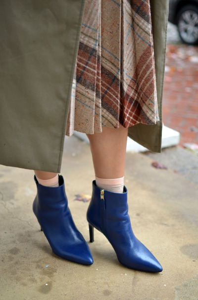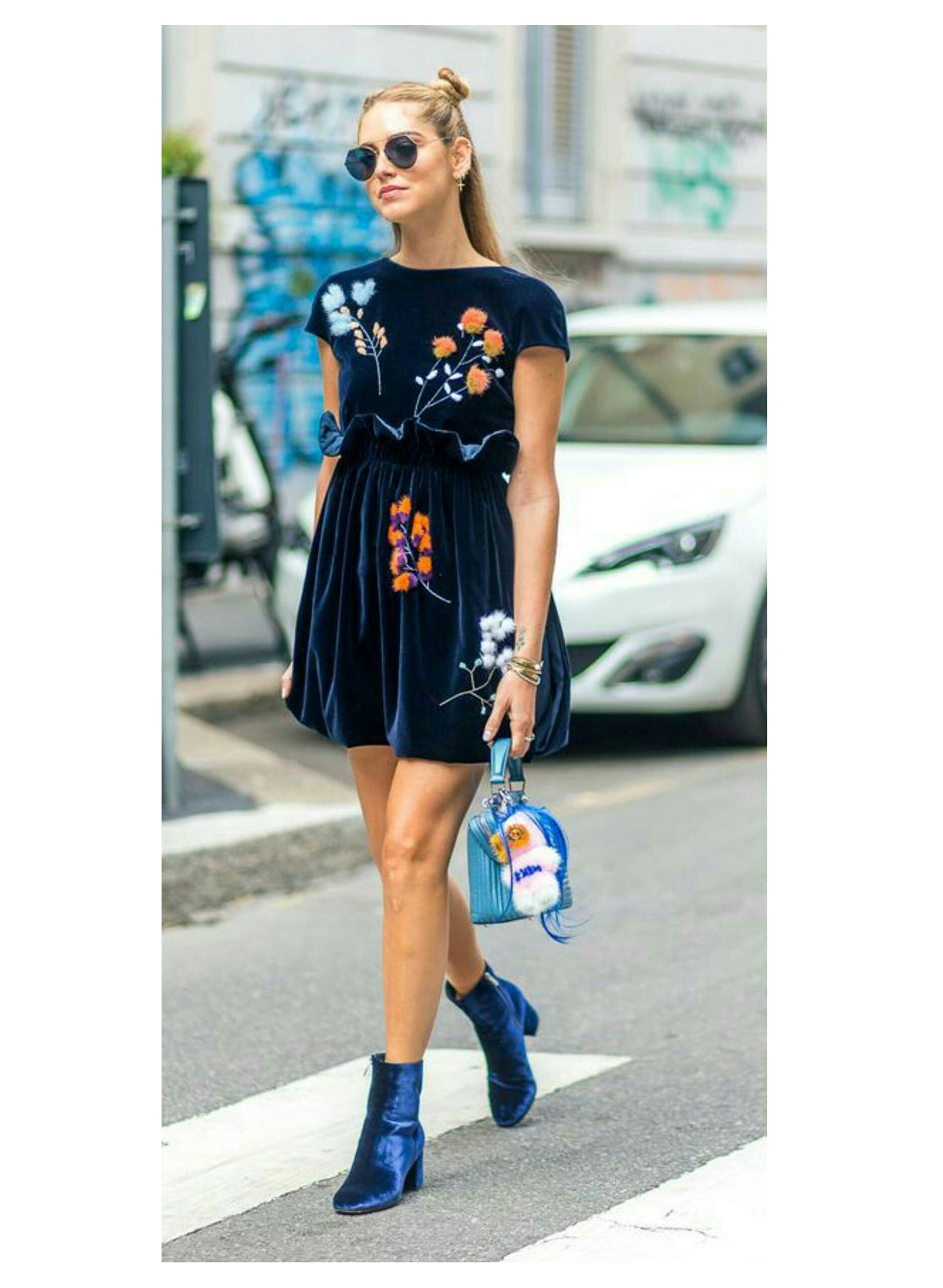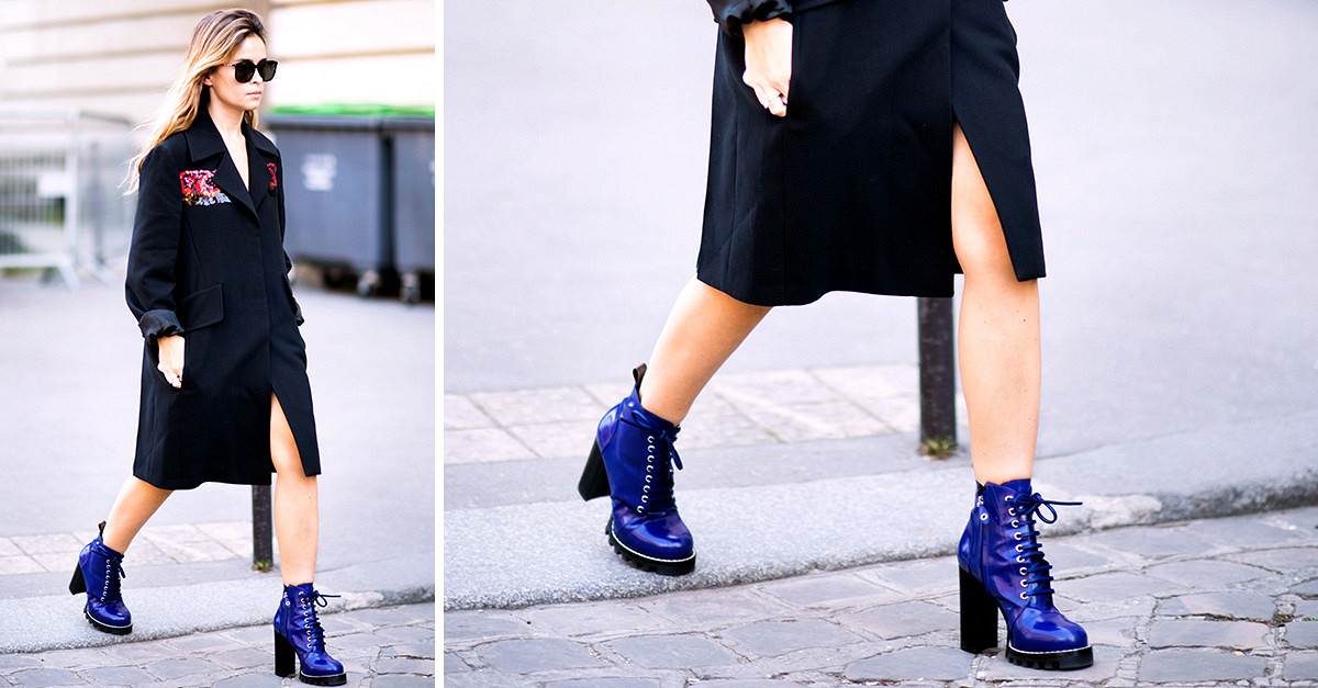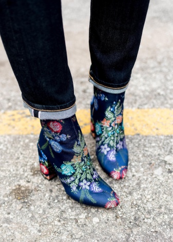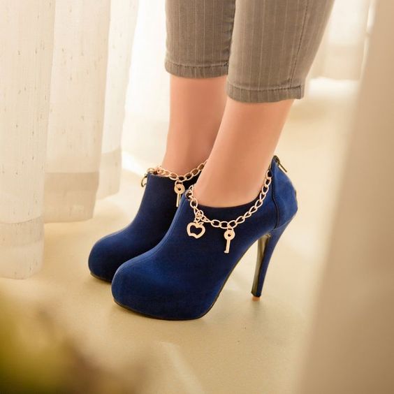 Blue booties are a bold choice. This color can compete in its originality and extravagance except that with black. It looks great with things of a contrasting color.