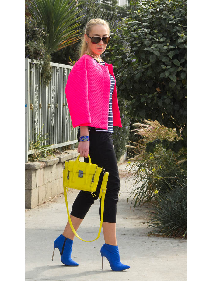 If you nevertheless decided that only blue will prevail in your outfit, then we select the bag in color for the ankle boots. Accordingly, the rest of the clothing and accessories should not attract attention.