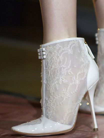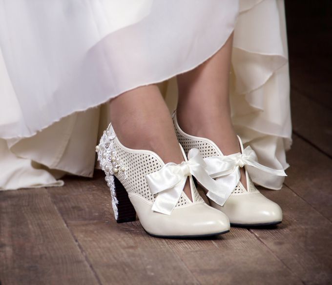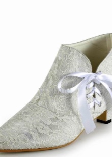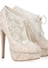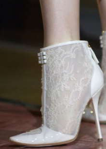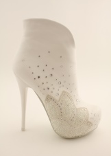 Ankle boots should be designed in the same style with a wedding dress, have one color, similar decor. Lacquered leather booties are perfect for a satin wedding dress, and lace models are perfect for a dress decorated with rhinestones, guipure and pearls.
