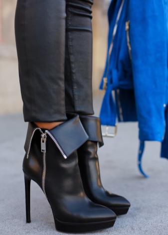 Relevant and leather models with a lapel. The high stiletto gives the leg elegance and grace, and the zipper, located on the side, becomes the highlight of the model, forming a lapel when unbuttoned. Such ankle boots can be combined not only with narrow jeans and leggings, but also with skin-tight leather pants.