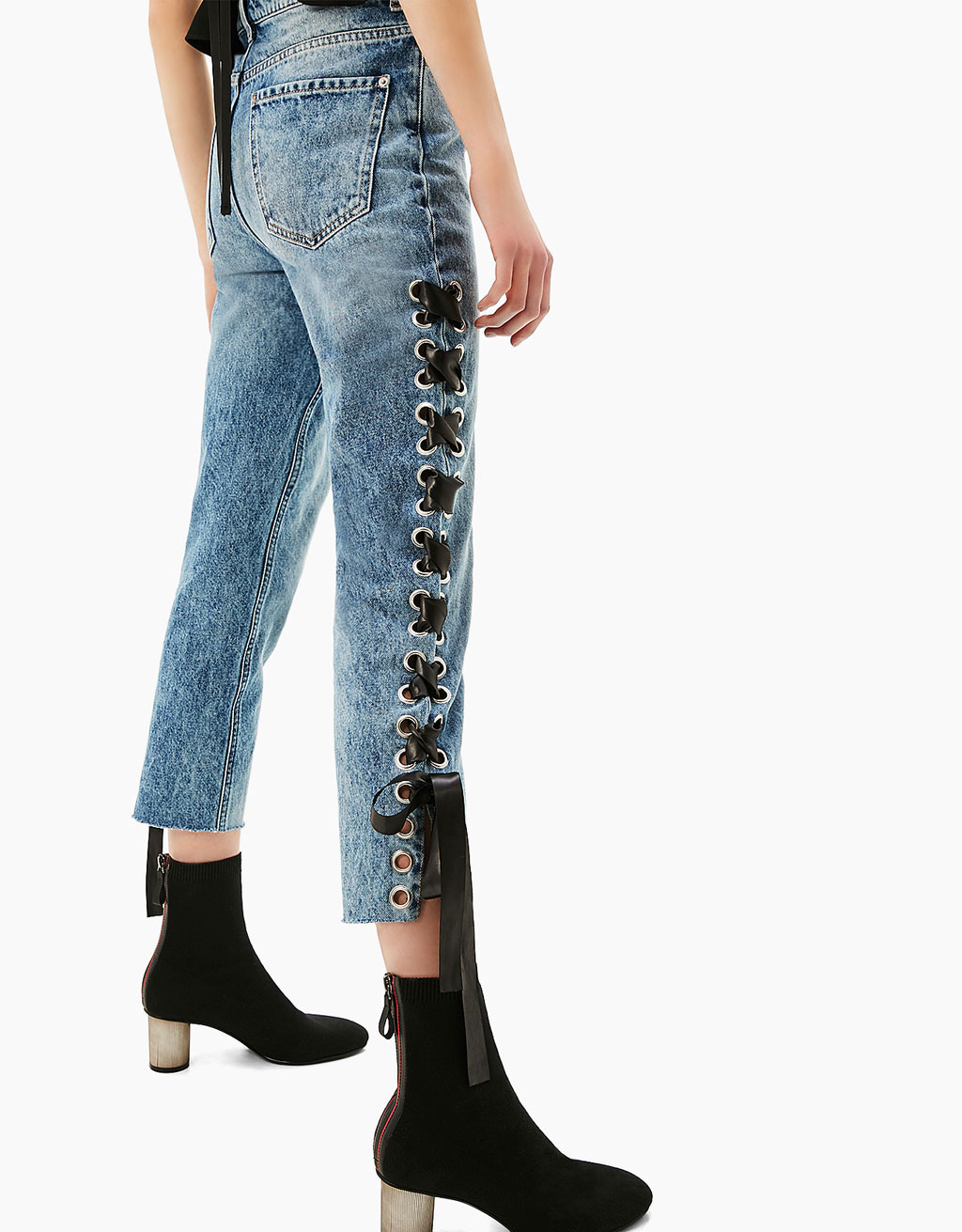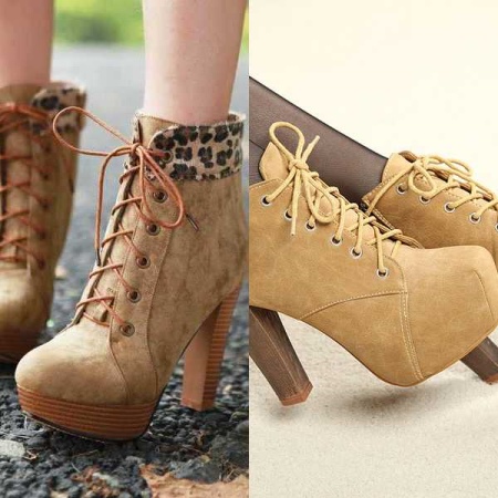 Beautiful boots with lacing and inserts of leopard print became a hit of the season. They have an average platform and a steady heel and are combined not only with short cloaks, jackets, oversight, but also sweatshirts, pullovers. As the bottom with such shoes fit tight pants, jeans, skirts of different styles. However, it should be excluded in the creation of the image too long products, which can disrupt the proportions and visually shorten the figure by adding to its fullness.