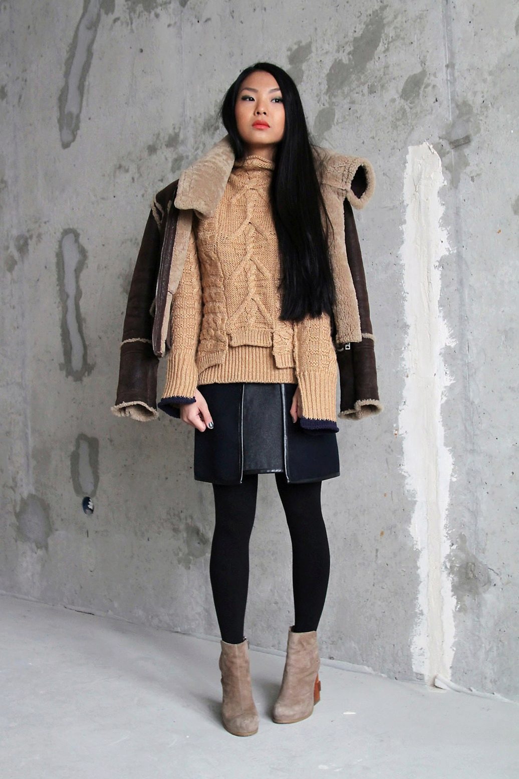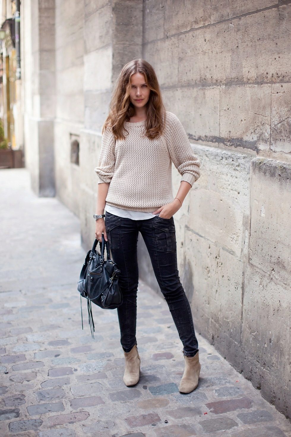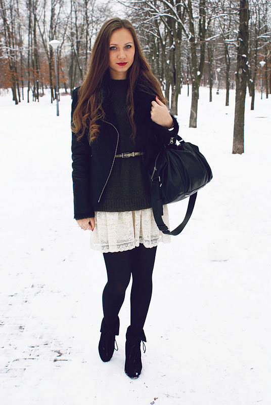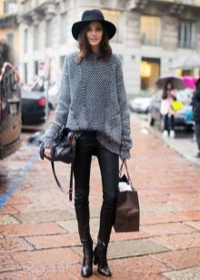 A cropped fur coat made of natural light fur is combined with narrow black pants and a beautiful gray sweater with large braids (note large earrings to match the sweater). Versatile black heeled ankle boots with a wide toe cap are a stylish addition to this ensemble.