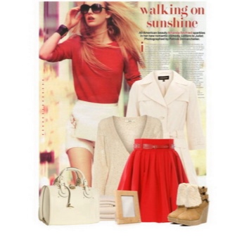 Red shoe boots with a wide cuff of warm sheepskin echo in color with a handbag and buttons of outerwear. Flared from the waist coat beautiful blue hue (and it is very well combined with red) has the original sleeves "flashlight". This youth ensemble is complemented by a voluminous fur cap and black tights.