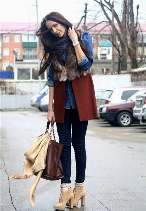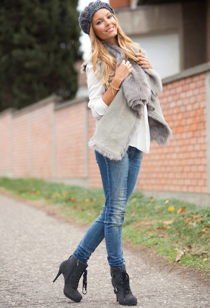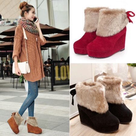 When choosing ankle boots, be guided by your basic style of dressing. It is rational for lovers of jeans to purchase a model of a sports orientation, for example, on a wedge heel with a wide fur trim or shoes on a flat run. Lace-up shoe boots will also harmoniously fit here. Glamorous, emphatically feminine young ladies will choose options with elegant heels, fluffy fur and various kinds of decorative details (chains, rhinestones, etc.)