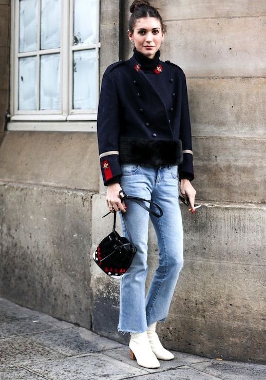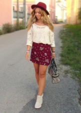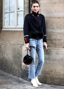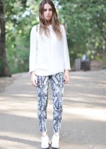 Recently, the combination of boots and bell bottoms has become topical. Extremely effective option for lovers retrostyle - shoe model with rhinestones. White shoes will be perfectly combined with a light blue bottom of thick fabric and the top, decorated with a bright floral print.
