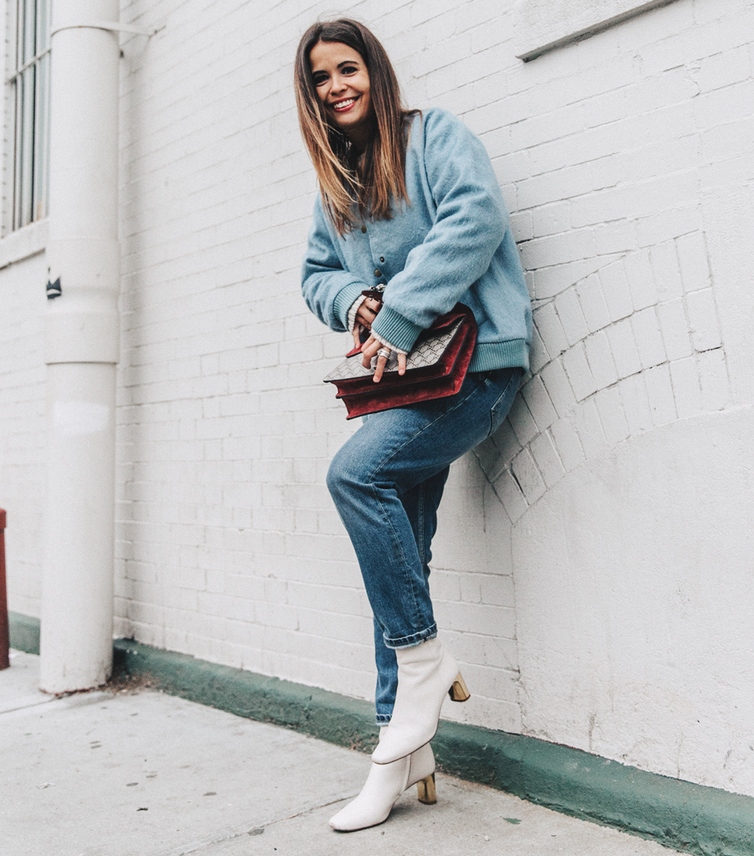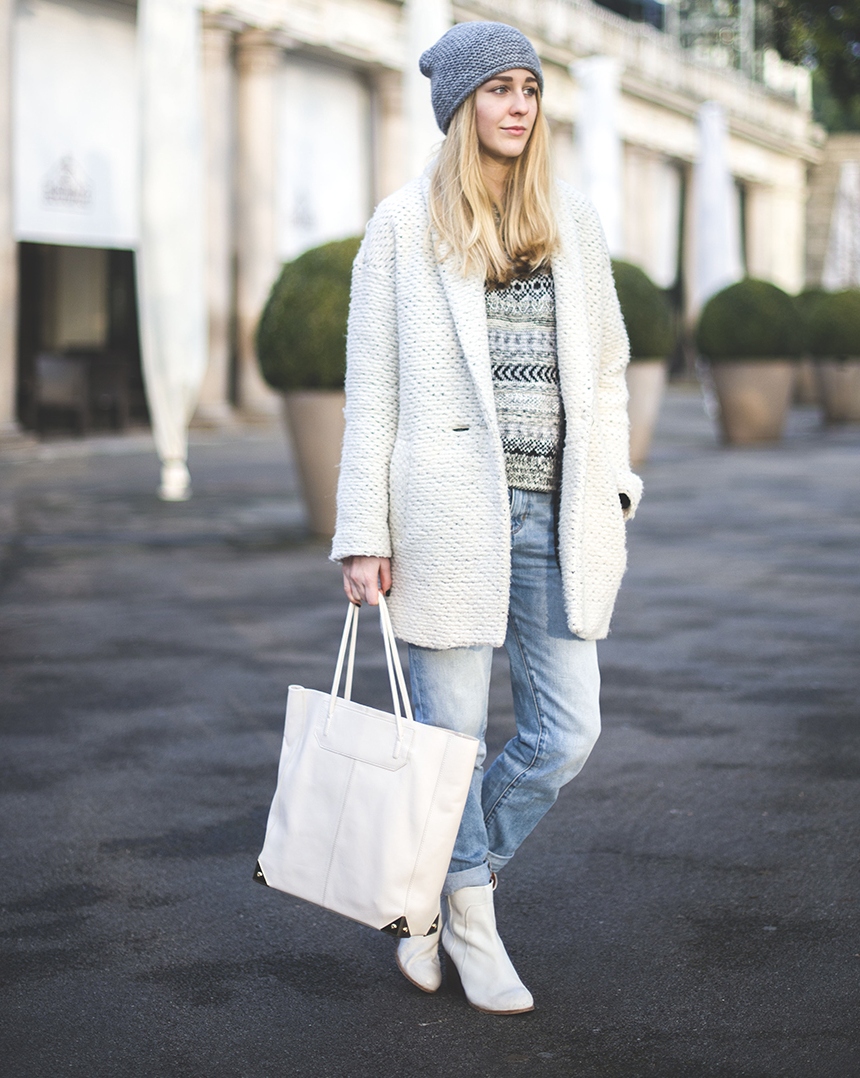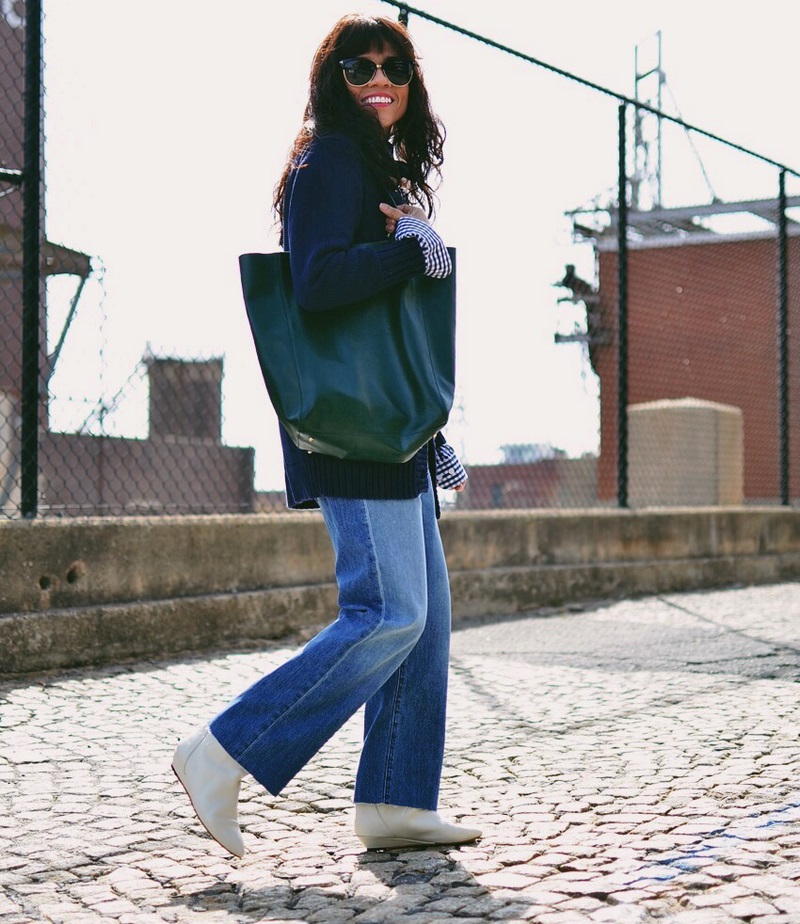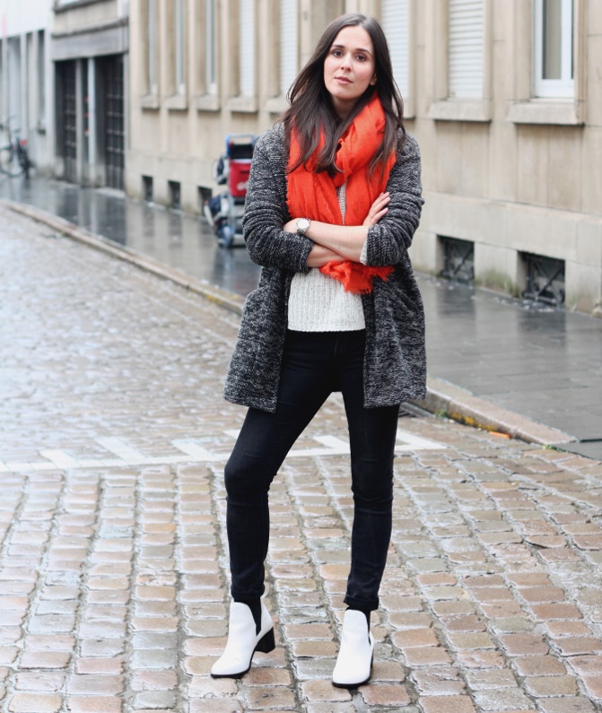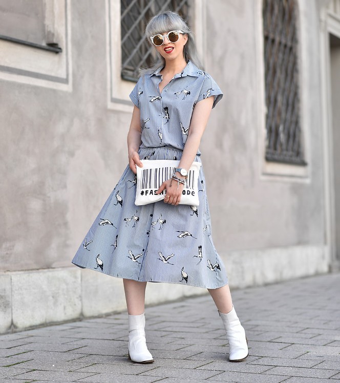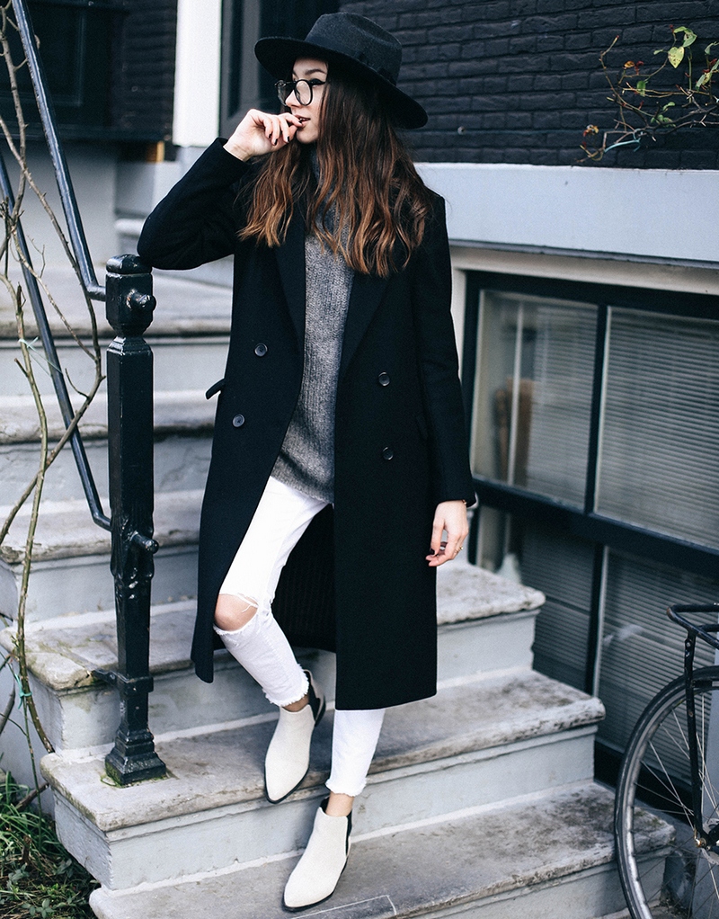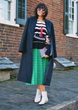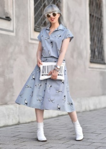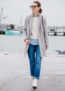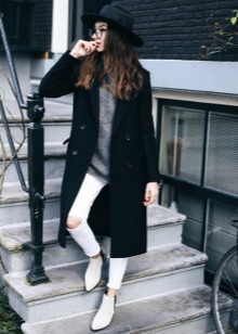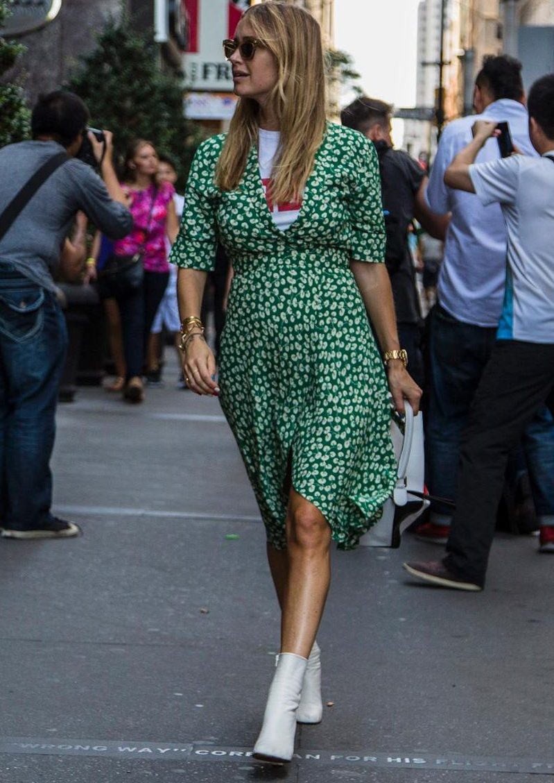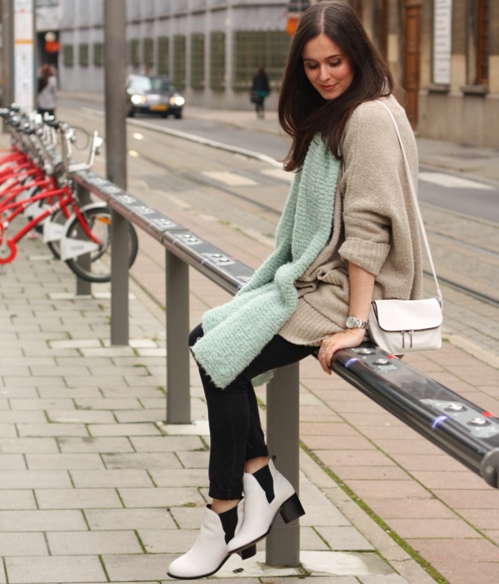 A more casual look can be created with a chelsea heel style boot and a midi length knit dress. It can be a simple cut, neutral gray or pale green. A similar image should be complemented with sunglasses with white rim or a light-colored small bag.