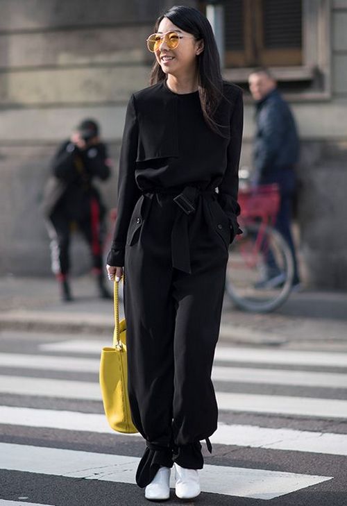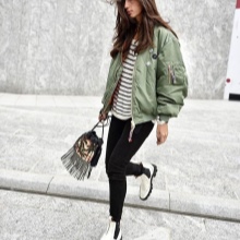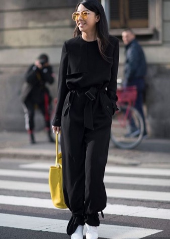 A more elegant style can be created with the help of trousers of bright color, narrowed downwards. The top in this case is better to choose black and free fit. In such a bow must necessarily be additionally present accessory light shade.