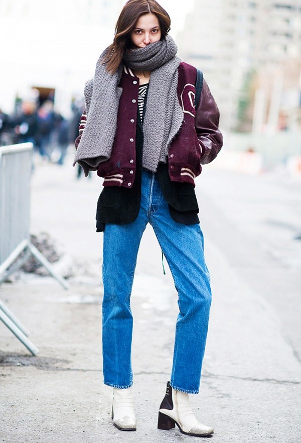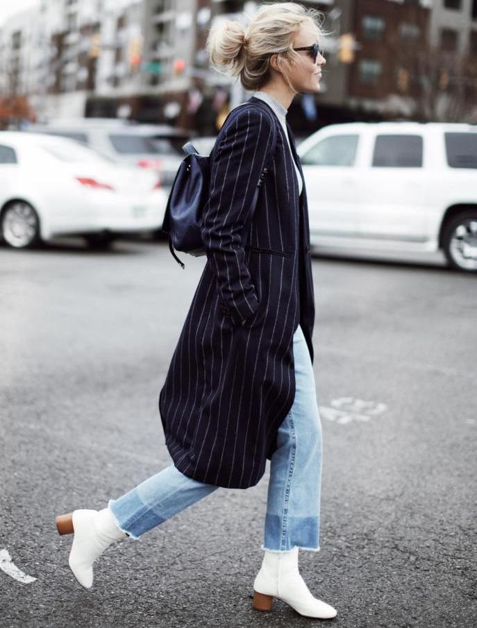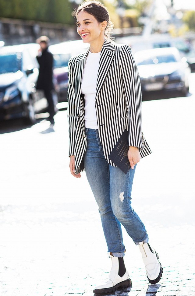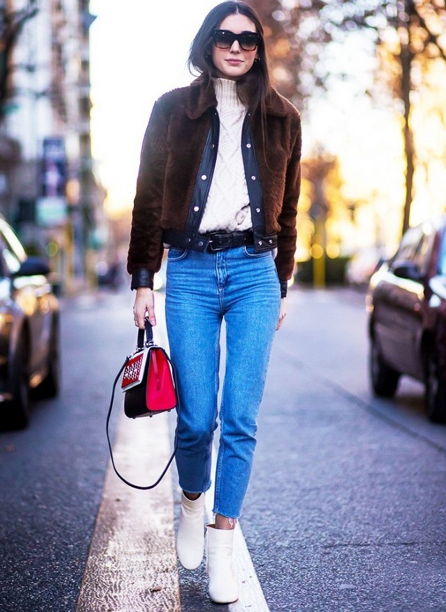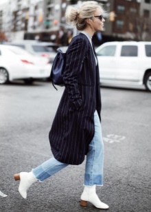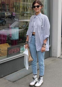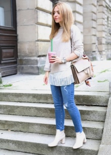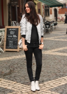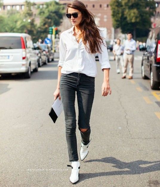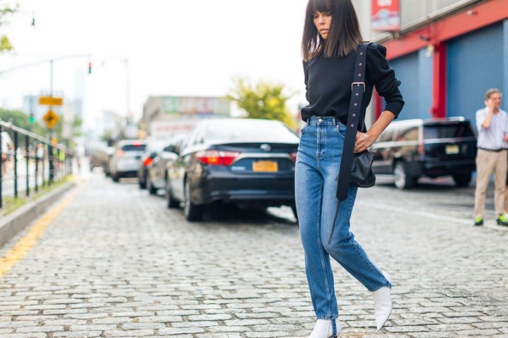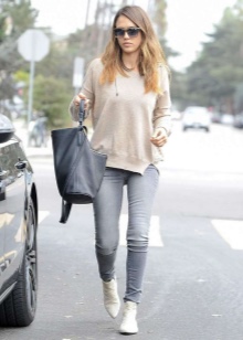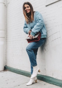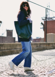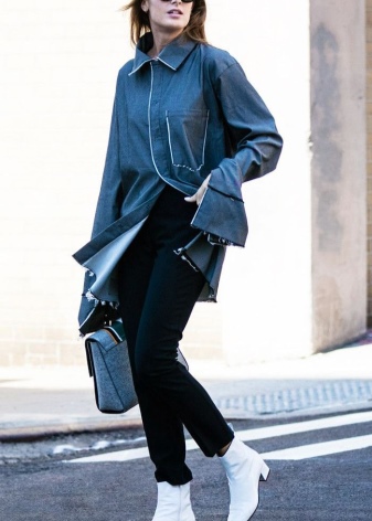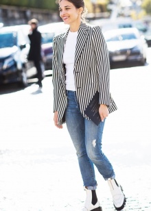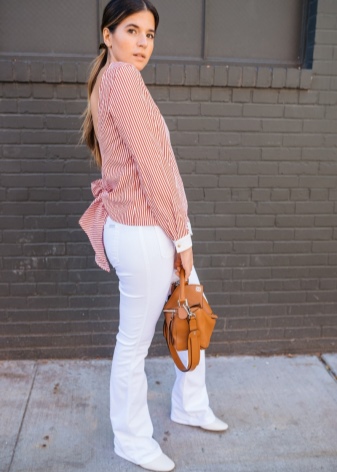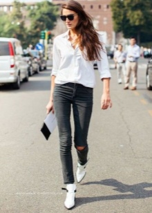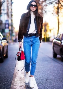 The most stylish and original image can be obtained by finding the right combination of white shoes with jeans. For low girls, stylists recommend combining such shoes with a bright bottom of tight-fitting or straight cut on a high waist. Medium and low rise jeans are suitable for tall women. As the top in this case it is worth picking up monophonic things: loose T-shirts, tight turtlenecks, crop tops or semi-transparent blouses.
