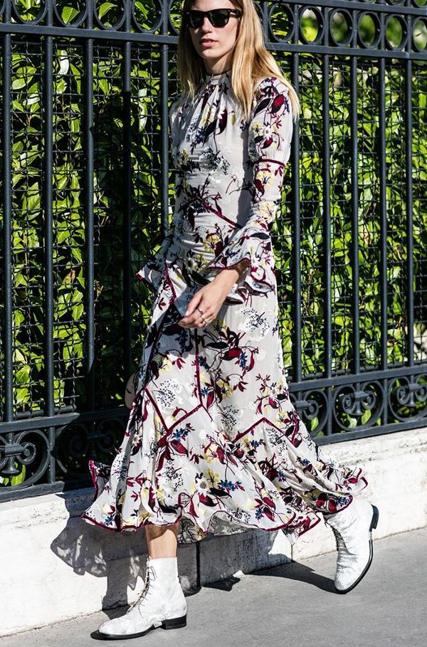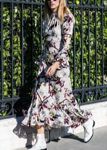So, with white shoes, stylists recommend combining voluminous dresses of lightweight fabrics in the style of boho. Thanks to the "flying" materials and small gentle prints that are inherent in this direction in style, such an image will look as romantic and feminine as possible.
