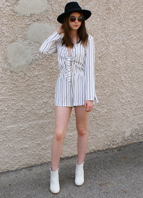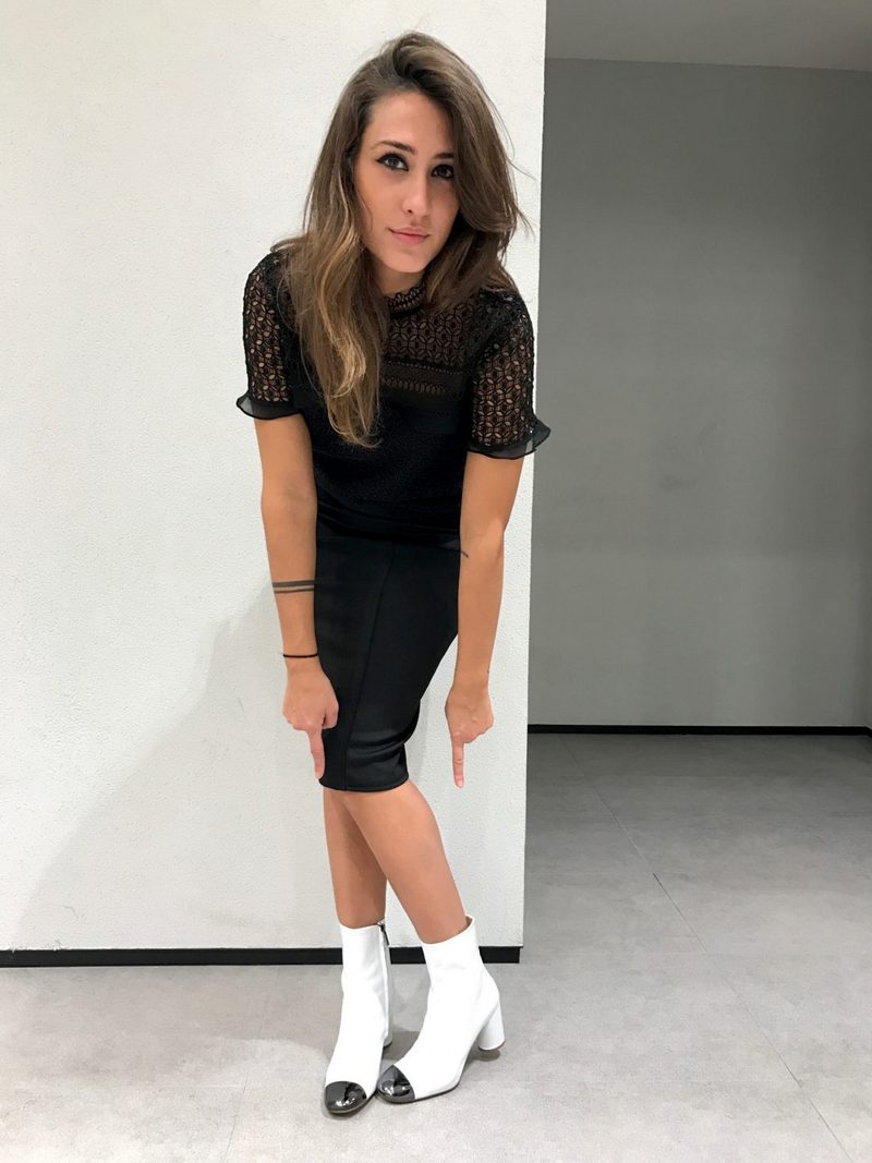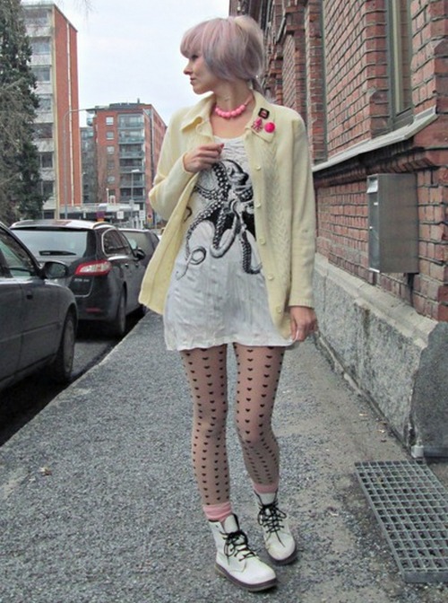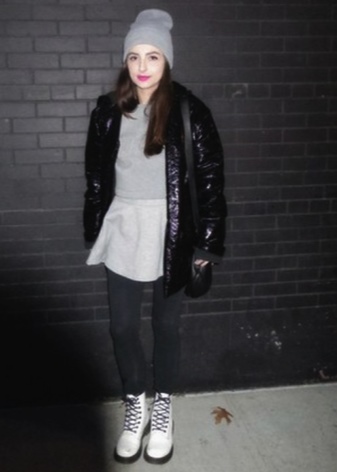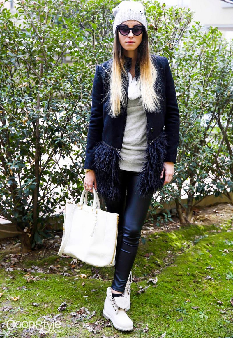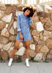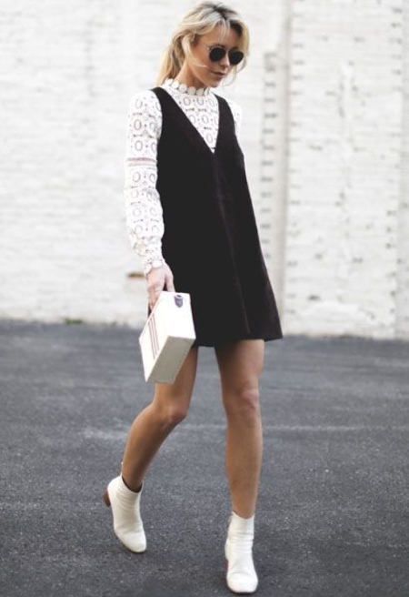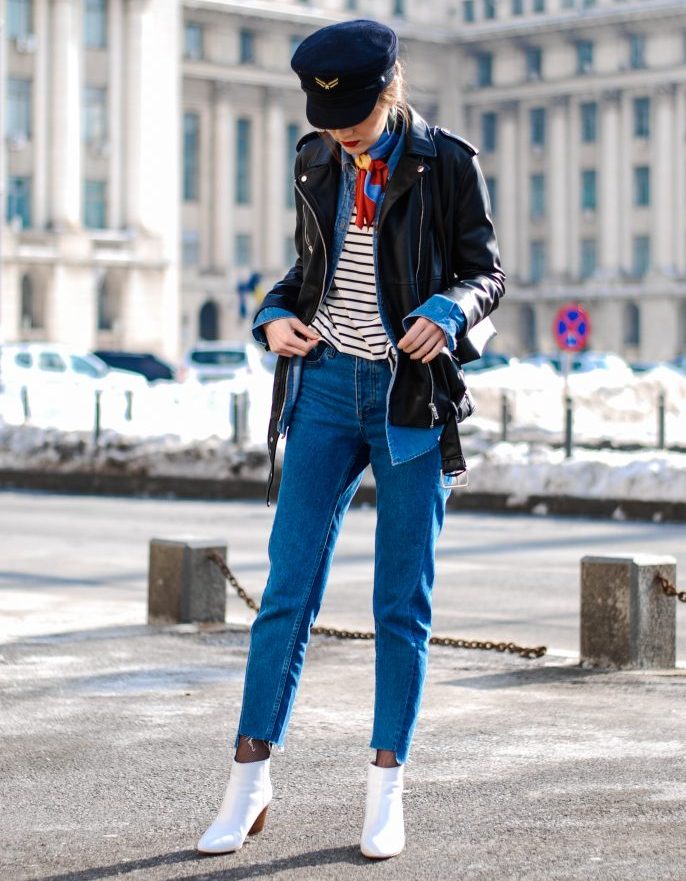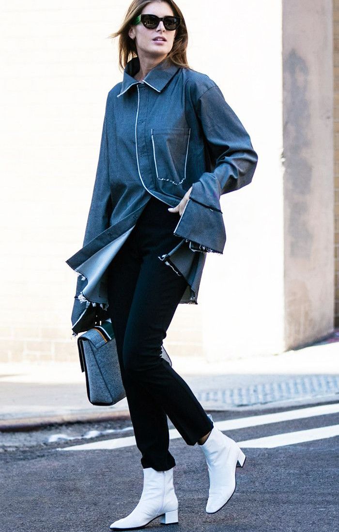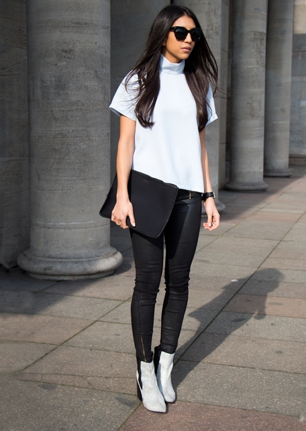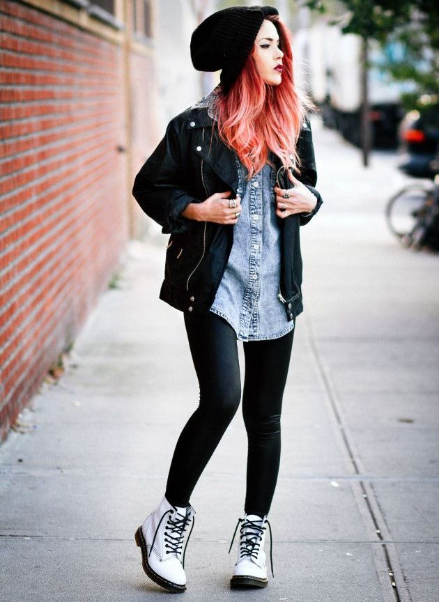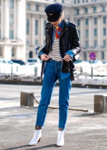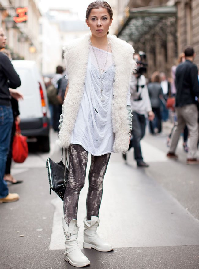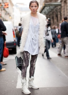 White-colored biker boots are suitable for completing an image consisting of a tight black dress, complemented by a large mesh pantyhose and a leather jacket, or a simpler one.