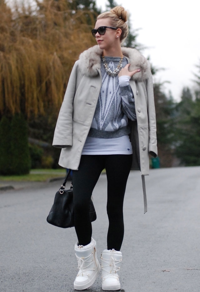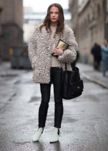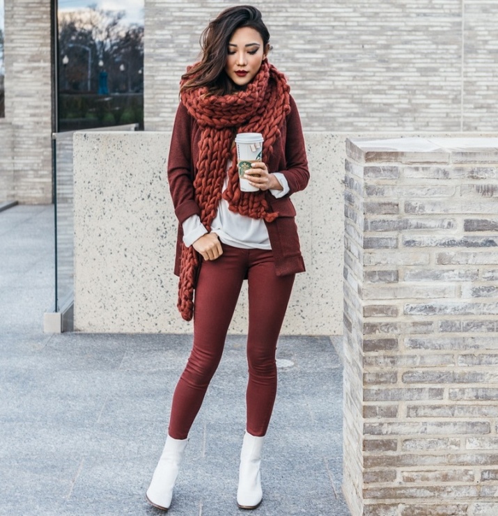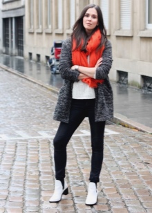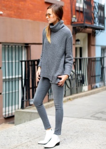 The combination of boots with leggings is a favorite autumn option for skinny women. As the top, the volumetric knitted sweaters with the neck of soft colors will look extremely stylish.