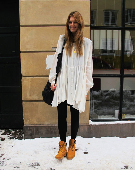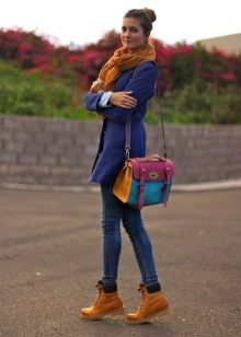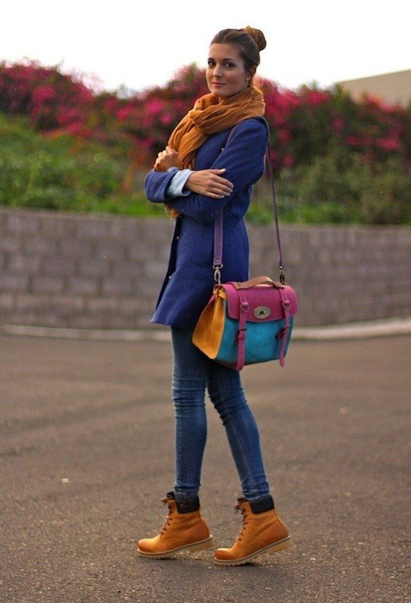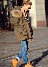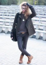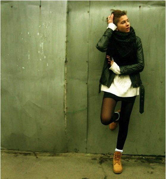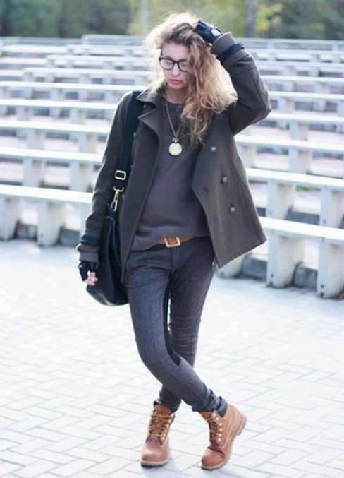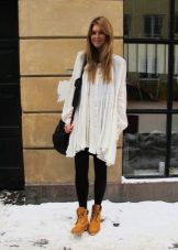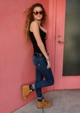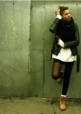 Timberlands are presented in the form of low shoes with laces and a grooved sole, which is characterized by a sporty style. With such shoes you can wear sportswear, jeans, thick trousers and shorts with tights. On the basis of the Timberland easily formed images in the style of casual and military. Although such shoes are rough, you can still combine leather pants / leggings and fur vests with them. It will turn out glamorous and unusual. If you consider yourself an extravagant special, you should definitely like the combination of a form-fitting short dress, leather jacket and heter.