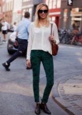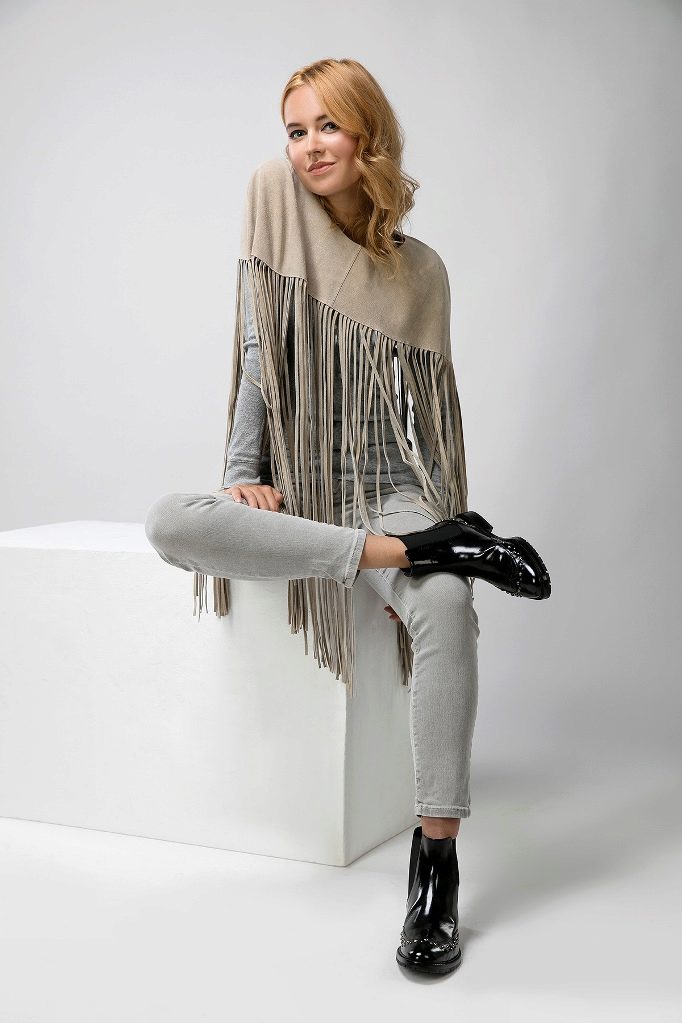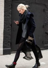 The image, created on the basis of gray and black shoes without a heel, in a priori can not be boring. The selected image, which consists of simple elements (skinny jeans, sweater, poncho and patent leather shoes at low speed) allows you to verify this. The game of shades and textures allowed us to create an interesting image, the highlight of which are shoes and ponchos. It is the footwear that draws all the attention to itself and emphasizes the rest of the elements of this image.