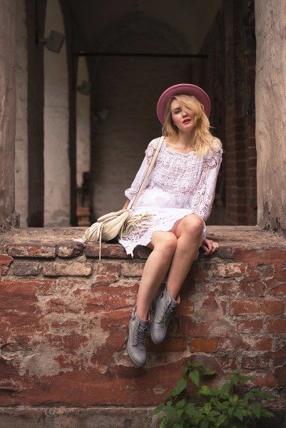 Are lacing shoes still too rough for you? Then you should look at this image, in which such shoes are combined with a light dress, a hat and a simple handbag. The game of contrasts is very pronounced here: the brutal and even to some extent provocative shoes together with the airy dress create an image that is filled with charm, expressiveness and attractiveness. Such an image will not leave you unnoticed among the crowd.