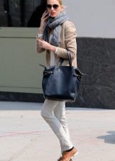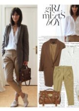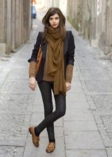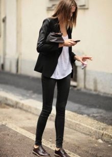 - Beige brogues with a dark shade in combination with dark blue skinny and a jacket with the same color fit harmoniously into casual style. The jacket is classic, shortened, with the sleeves rolled up. Under the jacket a neutral blouse of a free cut of a light shade is picked up - white, without decor and length to the waist. A dark brown bag successfully completes the image in the same tinged line as brogues with a shoulder strap. Makeup is accented on bright red lips. Practical tail and dark glasses give the image a severity and at the same time immediacy. From the jewelry selected thin metal bracelet on the wrist.