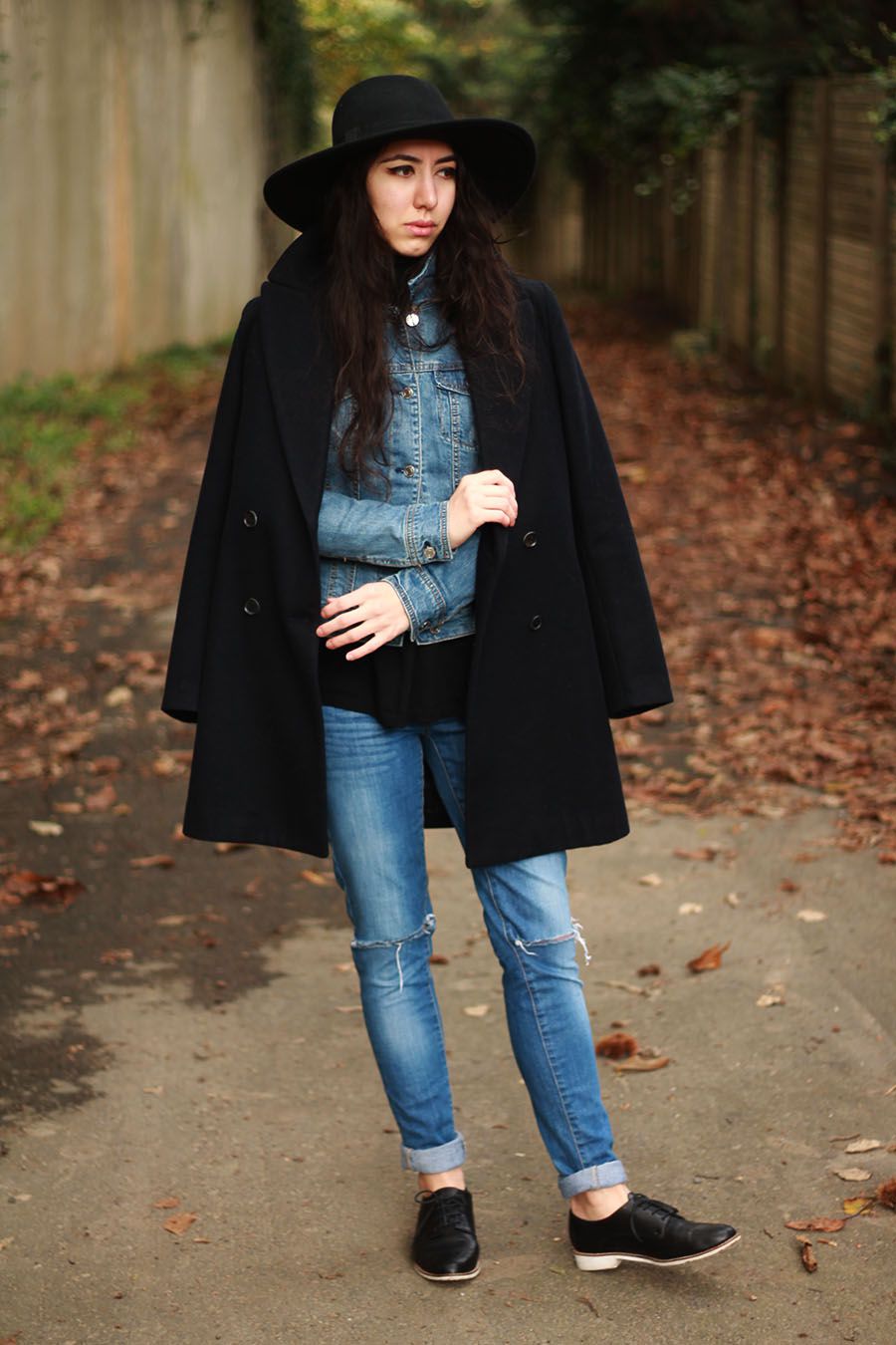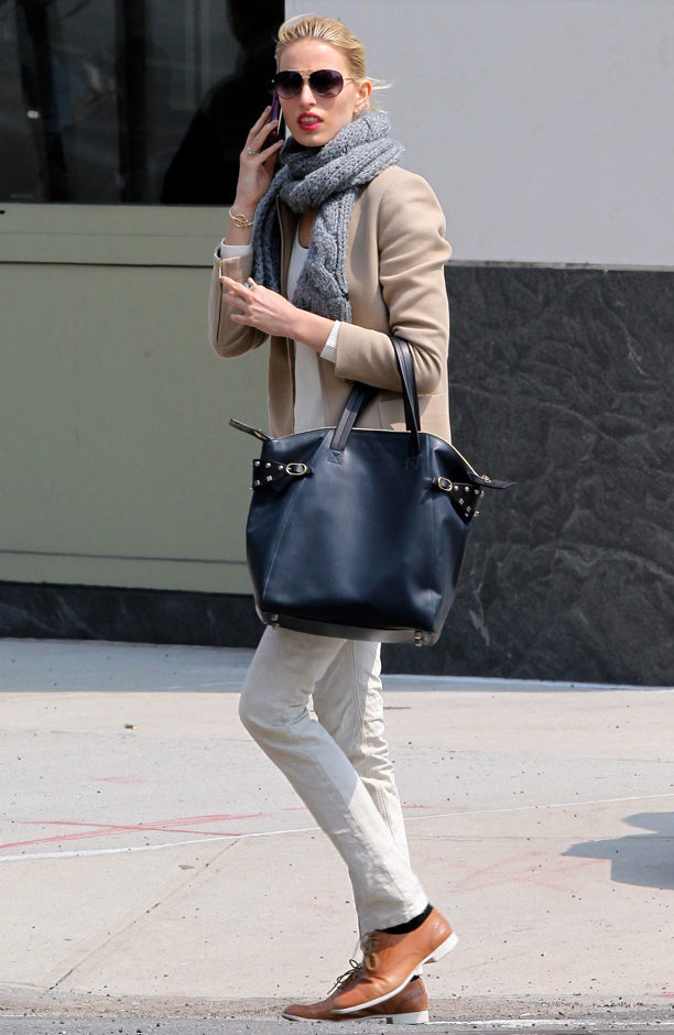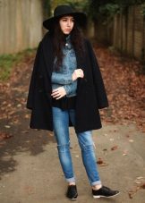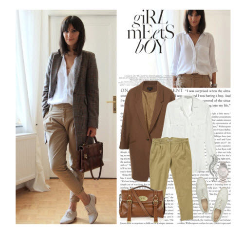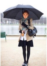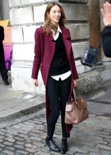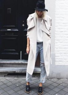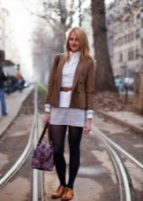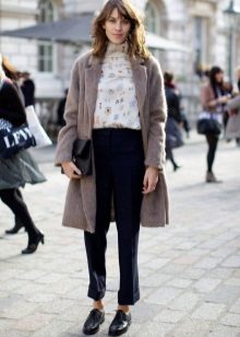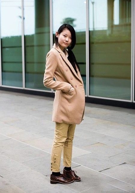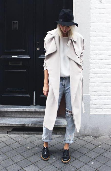 - The image of a stylish urban girl in a cool off-season will be given by dark brown brogues with a contrasting beige stitching between the sole and the upper part of the shoe, combined with an elongated coat jacket. Coat double-breasted peach color, matching shade with brogues. Long sleeves, turn-down collar, pocket pockets emphasize the practicality of the coat model. Under the coat look great beige skinny pants to the ankles with trim on the bottom and sides of the belly with contrasting dark buttons. These pants are combined with a light and concise blouse, T-shirt or long sleeve in the same color scheme. Black socks or stockings, visible between pants and brogues, perfectly complement the look. In this form, you can carry out walks around the city, go to school, meet friends, go shopping.