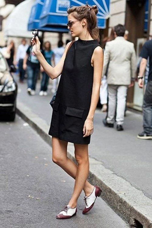 Dresses of a straight cut, or a trapezoid, a free cut - almost any match with brogues, except for the maxi length. A short dress would be perfect. Femininity and elegance will add an image of brogues in combination with a midi skirt or dress.