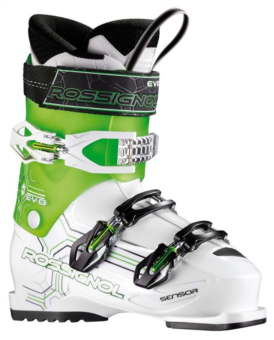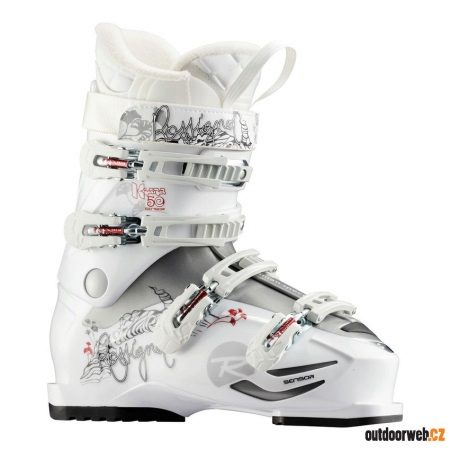 Rossignol Kelia 50. This model is for women. Stiffness 50. Width pads 104 mm. Very light compared to other brands of shoes with the same characteristics. Easily removed and worn, while perfectly fix the leg. Have three metal clips.