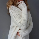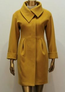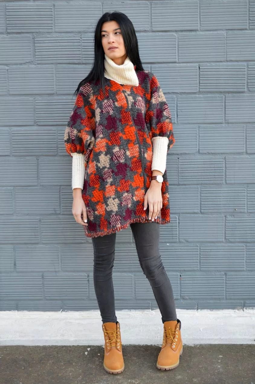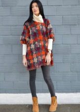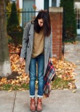Narrow chocolate-colored corduroy trousers, tan shoes or ocher colors. The voluminous sweater is gray and the long coat to the floor is also gray. Please note that the colors of the sweater and coat do not match. It is important that the sweater is 2-3 tones lighter coat. Then your image will be perfect.