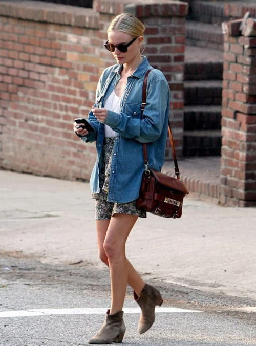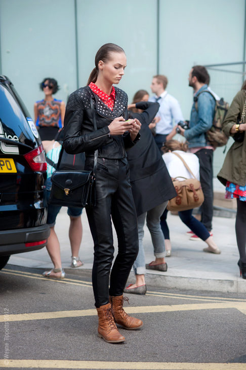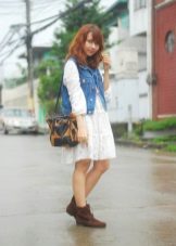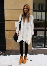 Remarkably look heavy army brown boots and light flying dress of silk, white or flesh-colored. Due to the difference in textures, the image is unbroken, a feeling of insecurity and innocence is created, as if you had just thrown off tired pin-up shoes and hastily changed shoes into your boyfriend's boots.