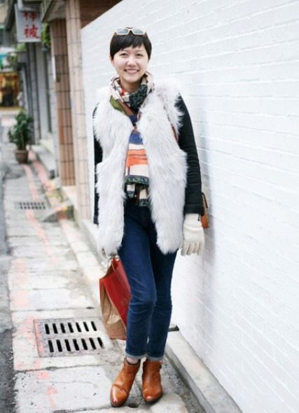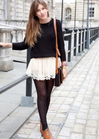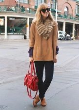 Tight corduroy velvet trousers, brown lace-up boots, voluminous sweater (it may be white, for example) and a bag with a fringe. Such an ensemble is suitable for traveling, relaxing with friends or for work.