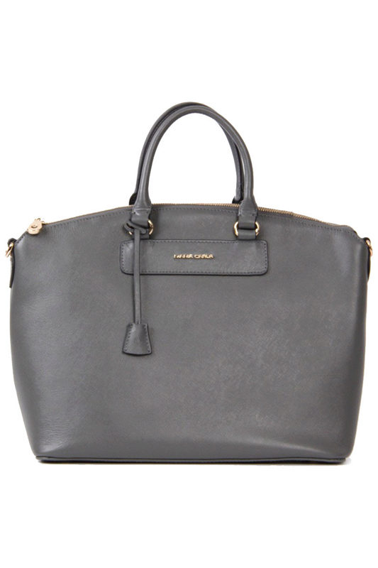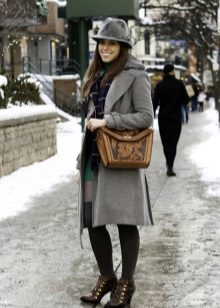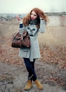 Wonderful autumn option: a gray coat of a mouse shade and reddish-brown boots. Bag over the shoulder to match the shoes and takes. He, by the way, can be both red and beige.