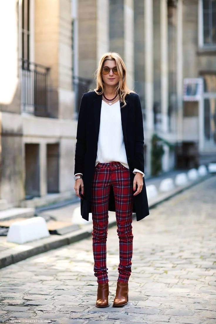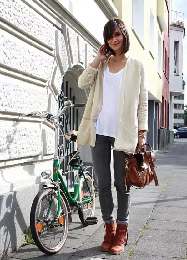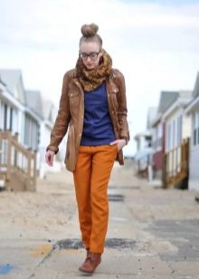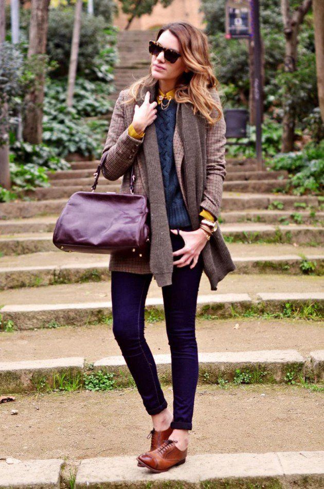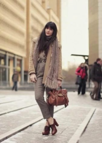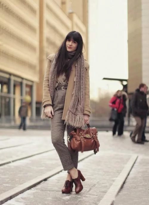 And here's another option for walking: straight pants, brown shoes. You can even tone to tone. It does not matter if the shirt is visible from under the jacket. Bag over the shoulder of neutral tones, volume scarf. You are ready to go!